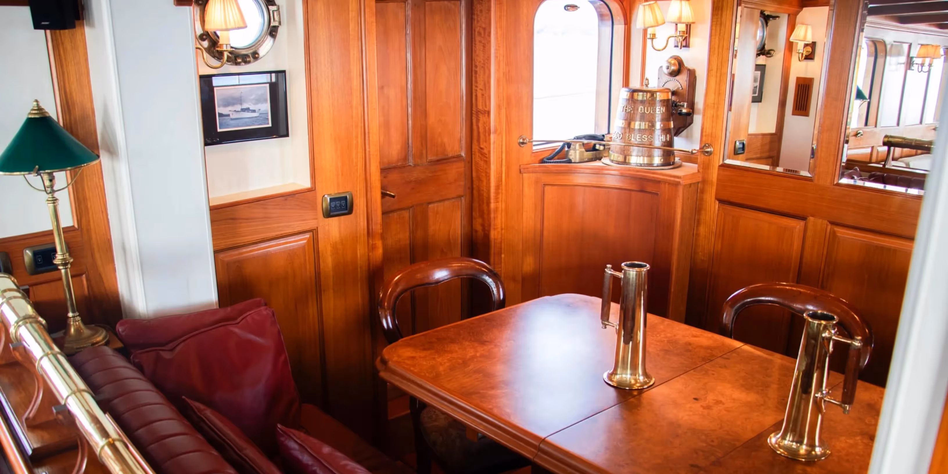 Lady Hertha’s exterior is a symphony of varnished wood and polished brass, all meticulously maintained to radiate timeless elegance. The ion-bonded brass fittings shimmer under the sunlight, while the brightwork’s deep lustre adds an air of refinement. Signature gold-braided blocks and tackles serve as a charming reminder of her storied heritage, blending effortlessly with modern conveniences hidden within her classic design.