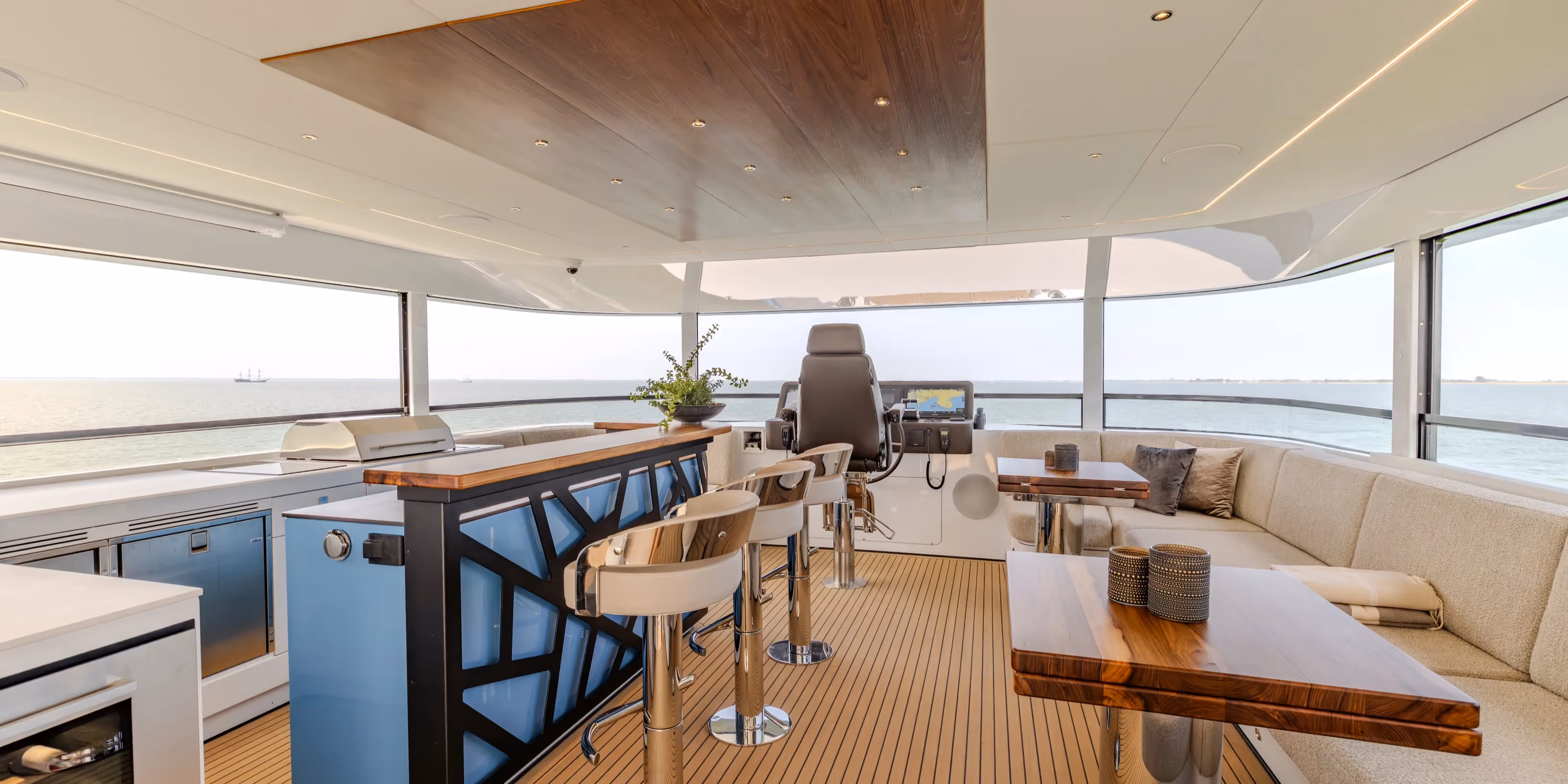 Inside, the Ocean Explorer 85 exudes a calm, refined atmosphere. Her bright and spacious main saloon, highlighted by panoramic windows, blends seamlessly with natural finishes and thoughtful ergonomic touches. An elegant spiral staircase connects the main living area to the upper deck, a stylish yet practical feature that enhances onboard flow.