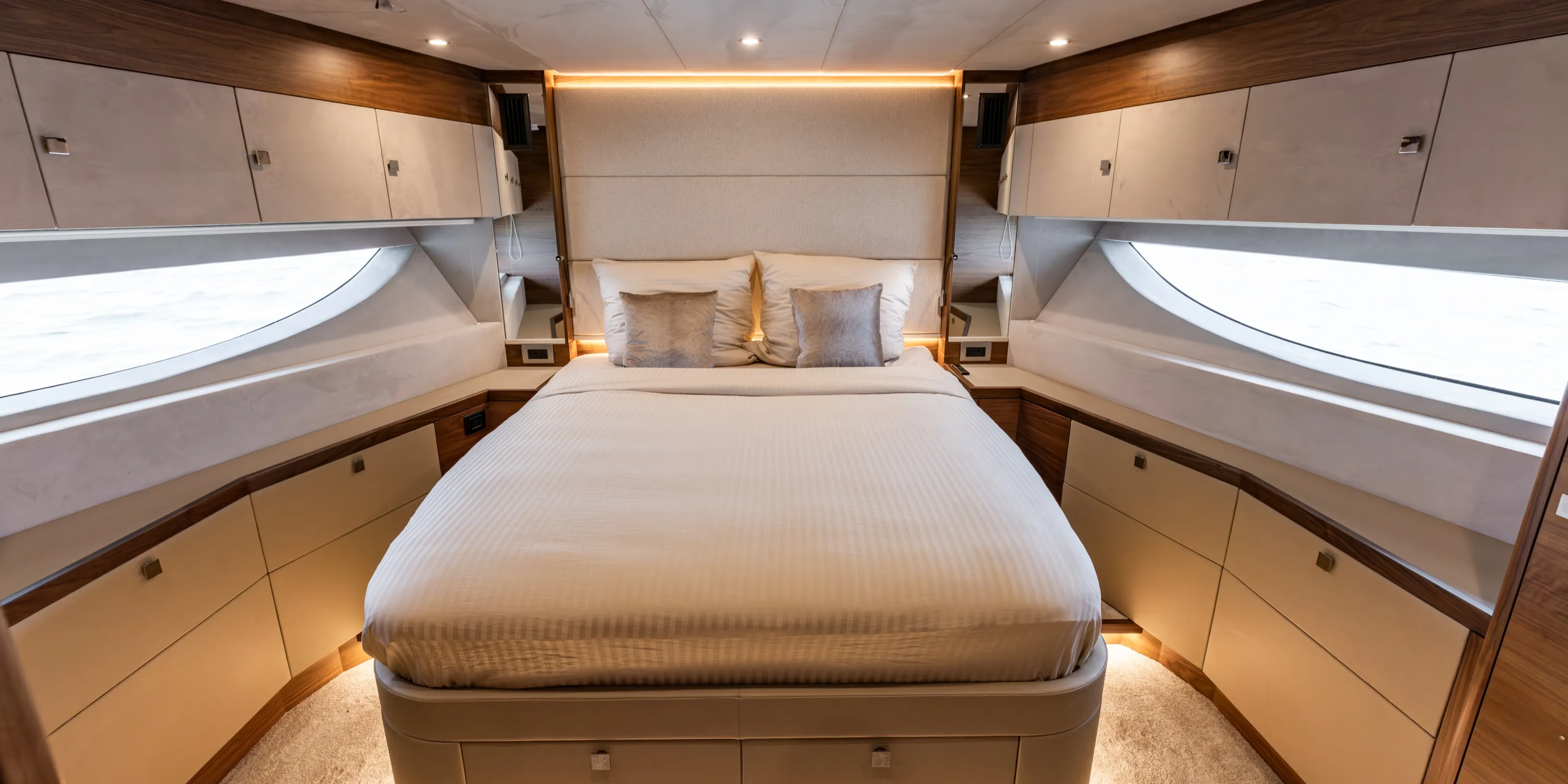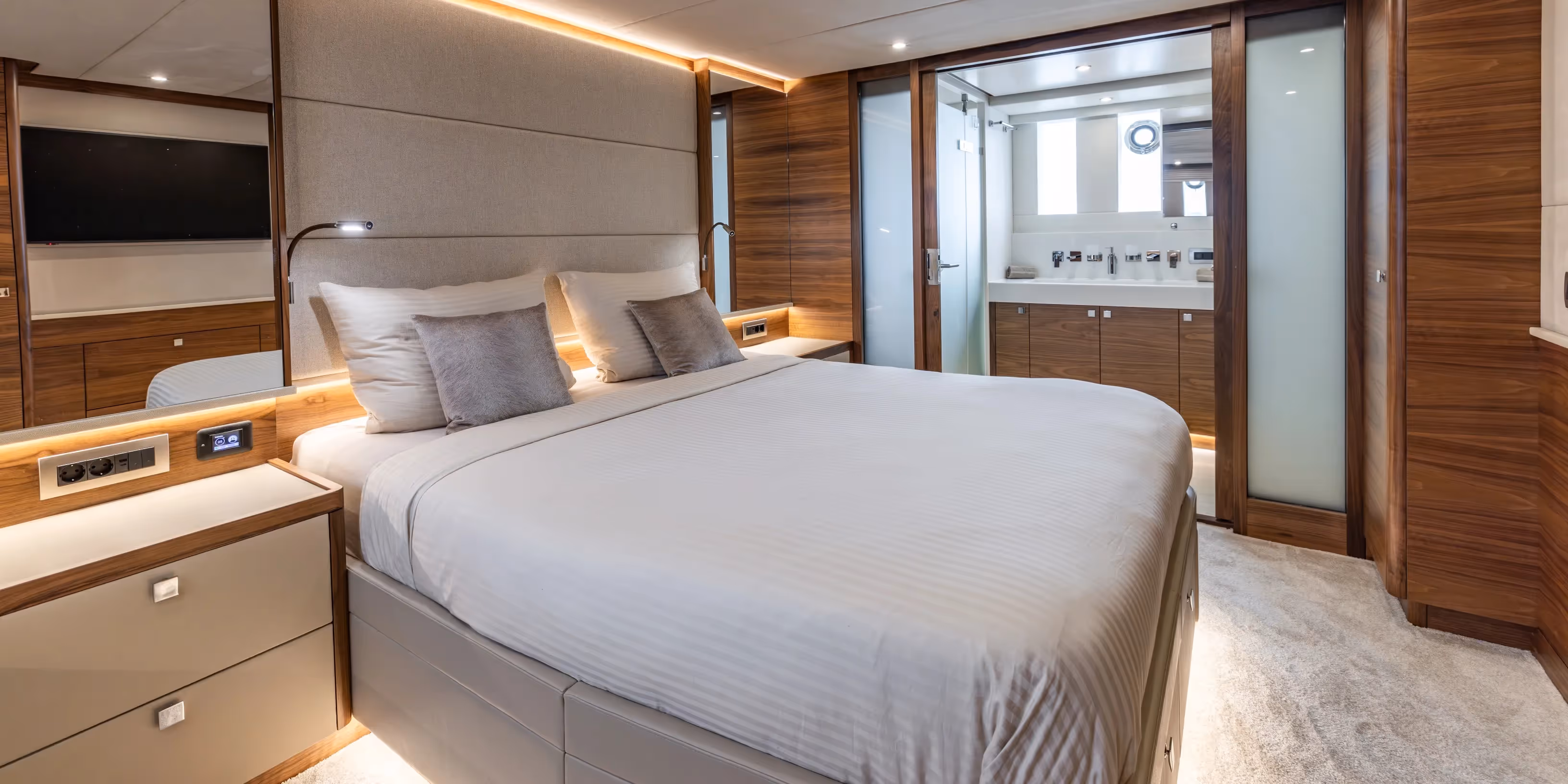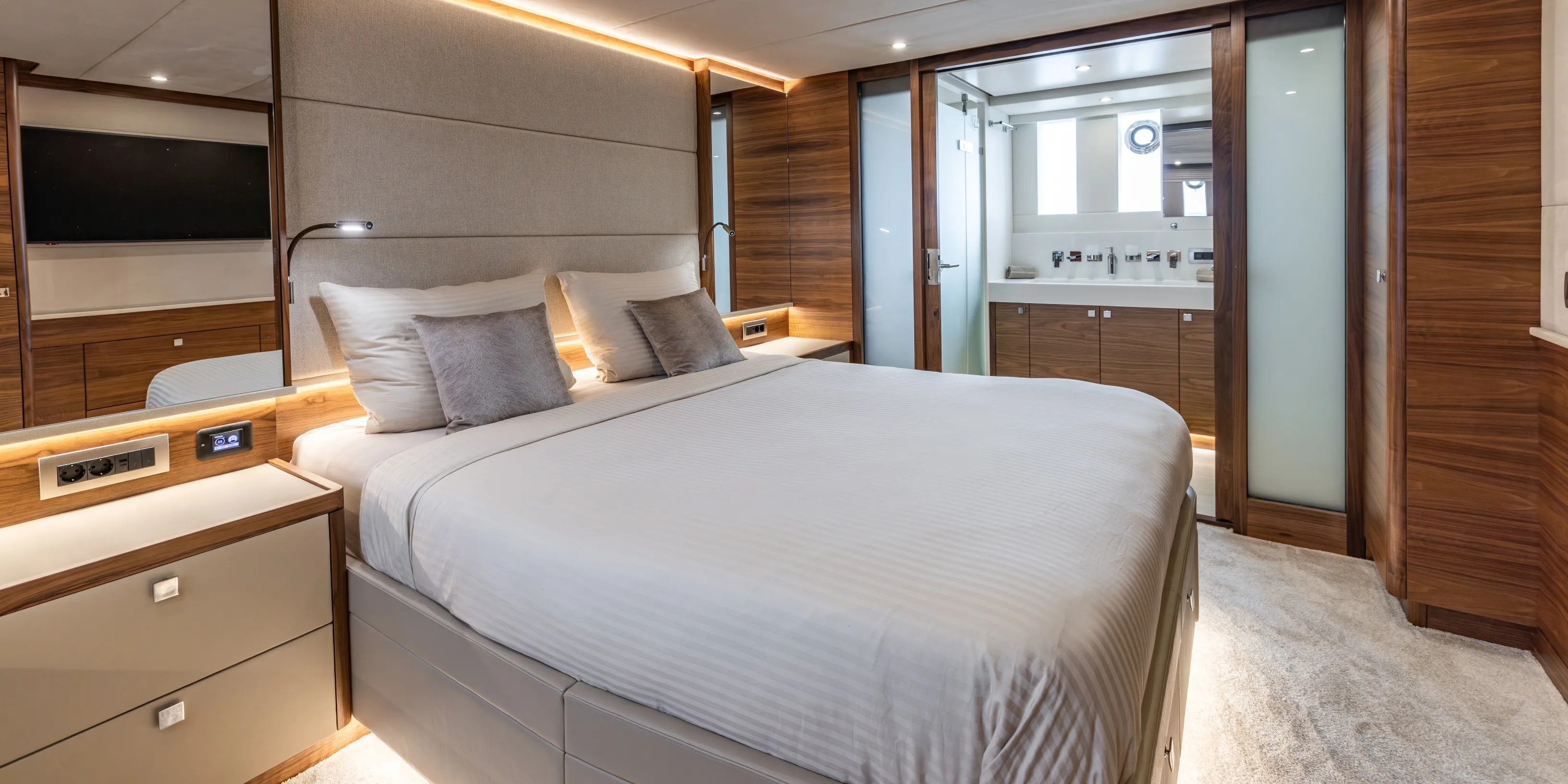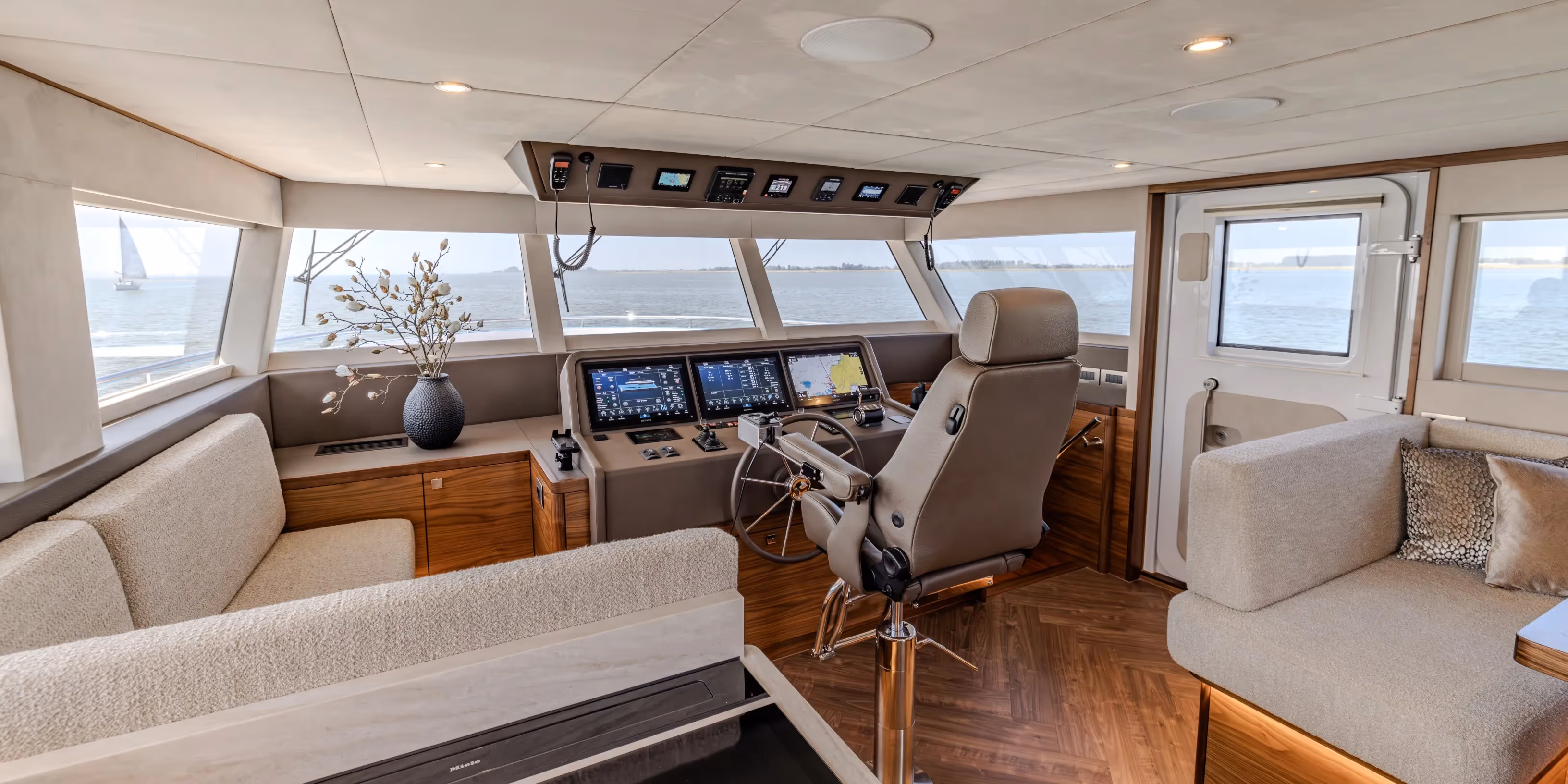 The helm station aboard the Ocean Explorer 85 showcases excellent visibility and state-of-the-art navigation electronics, optimising both safety and ease of use during extensive cruising. Thoughtful engineering ensures crucial systems and mechanical spaces are easily accessible, allowing efficient maintenance and operational reliability during extended voyages.