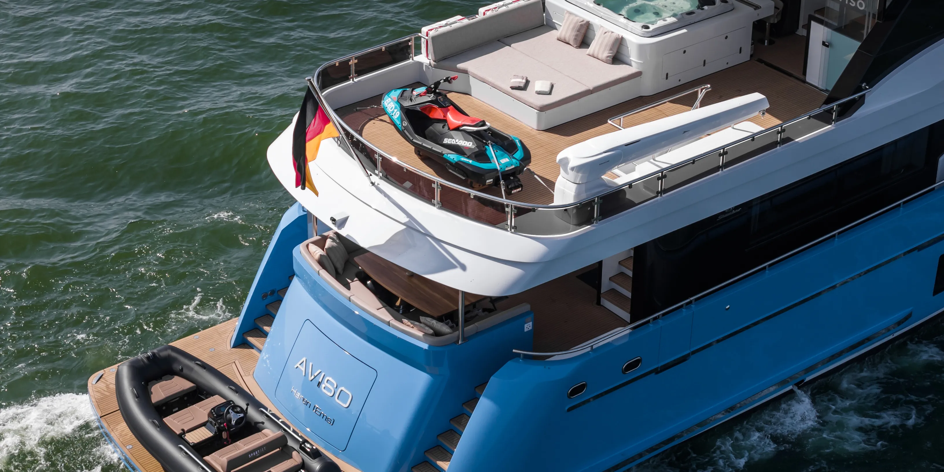 At first glance, the Ocean Explorer 85’s imposing profile and distinctively elegant lines immediately assert her credentials as a true ocean-going yacht. The blend of practicality and aesthetics is evident, with a deep blue hull paired against stark white and black elements, which enhance her seaworthy image while maintaining a sleek, contemporary appeal.