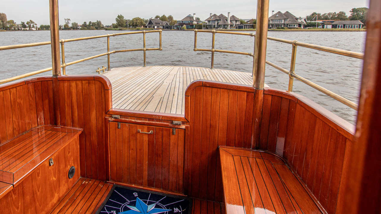 Steel deck with teak overlay. Brass and copper deck hardware, teak/brass windscreen, copper sea rails and grab rails. Dorades for passive ventilation. Wooden boarding ladder aft.