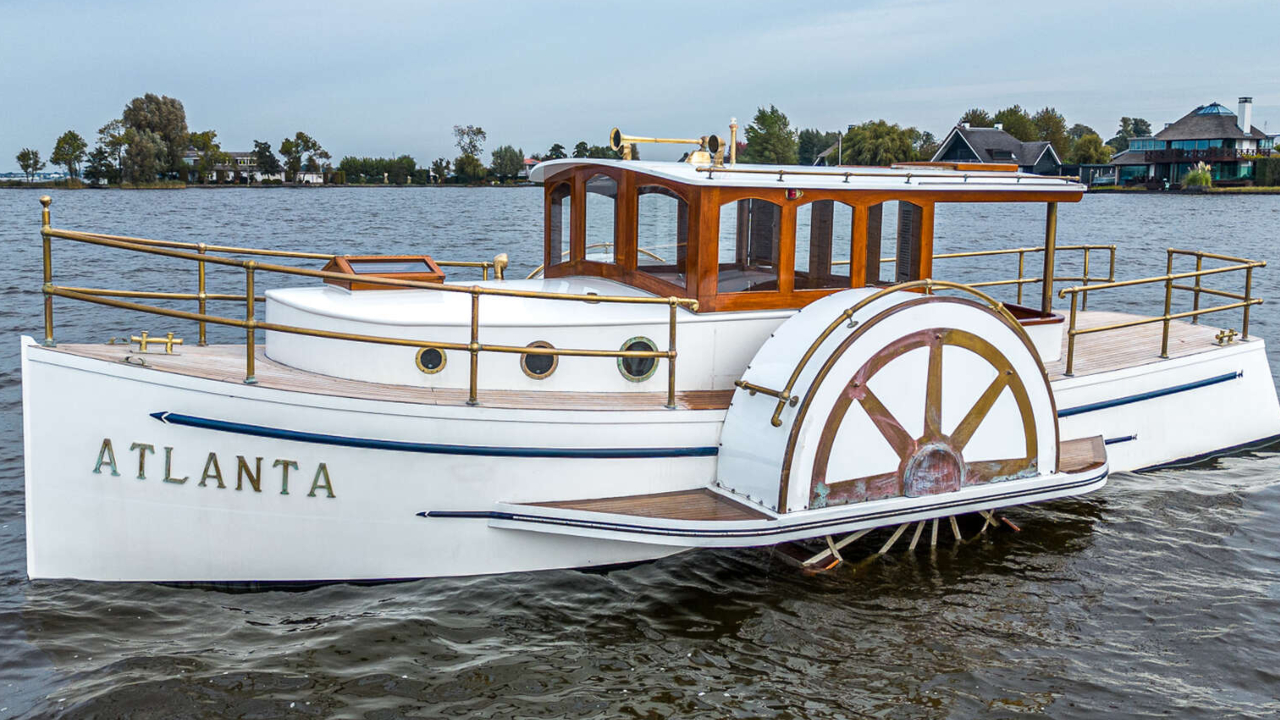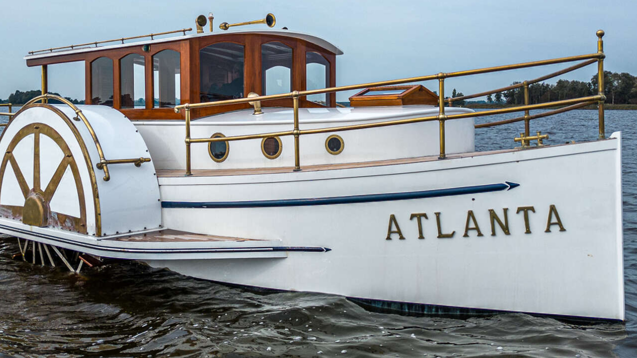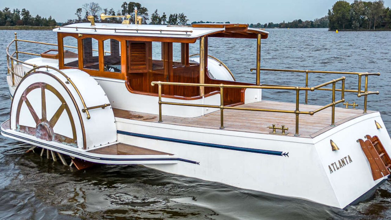 ATLANTA is a 10m steel paddle-wheel yacht built in 1992 by Volharding. She features teak decks, copper rails, mahogany joinery and a hydraulic paddle-wheel propulsion system driven by an 88hp Iveco diesel engine. The engine has approx. 80 hours. Fuel comes from twin 200L steel tanks (53 US gal each) and water from a 250L stainless tank (66 US gal). Starting bid is €50,000 (approx. £43,000 / $54,000). She is ideal for river and inland cruising with a cruising speed of 6 knots and a top speed of 8. Auction link available on request.