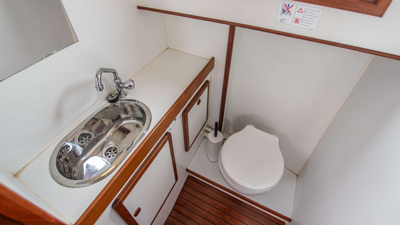 12V and 230V system with Victron isolation transformer. Start battery is 140Ah Bosch. Service bank consists of two 180Ah Bosch batteries. Electrical water pressure system feeds galley and head. Navigation lights and interior lighting throughout.