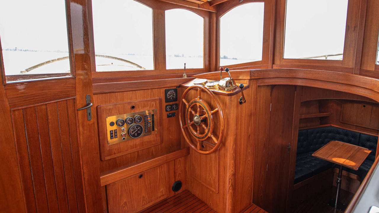 10m steel paddle-wheel yacht with teak decks, mahogany interior, and hydraulic drive. Starting bid €50K at auction