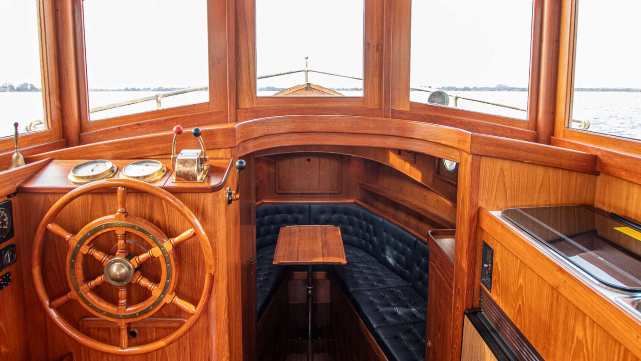 The hull is steel with multi hard chine form, epoxy-coated and fully sandblasted. Superstructure is wood, with full teak deck overlay. Brass hatches, copper portholes, and dorades add vintage styling. Window frames are wooden with tempered glass. Stainless rubbing strake and copper safety rails complete the aesthetic.