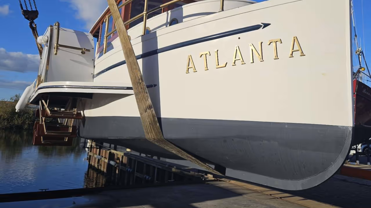 ATLANTA is a 10m steel paddle-wheel yacht built in 1992 by Volharding in the Netherlands. She features a hydraulic drive, 88hp Iveco diesel (only 80 hours), twin paddle wheels, and a freshwater-cooled exhaust. Her layout includes a convertible dinette berth, electric toilet, compact galley, and enclosed wheelhouse. Teak decks, copper and brass trim, and rounded joinery define her finish. Electrical system is 12V/230V with Victron insulation transformer. Twin 200L fuel tanks and a 250L stainless water tank. Auction starting bid: €50,000 (approx. £43,000 / $54,000).