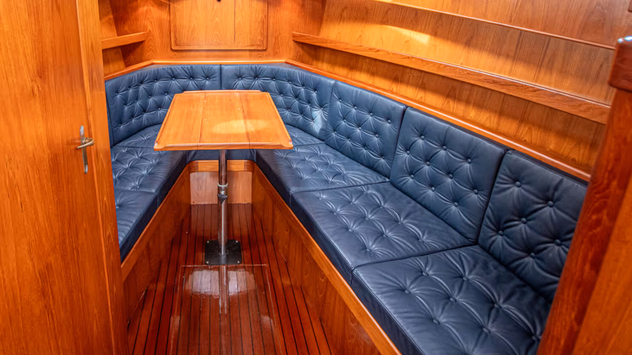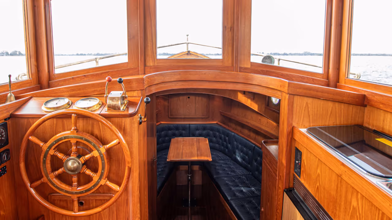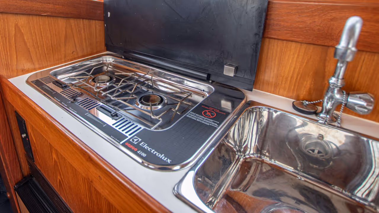 Convertible dinette berth (1.90m length), enclosed heads compartment with electric toilet and stainless basin. Compact galley with stainless sink, Origo 4100 spirit stove (two burners), fridge with freezer compartment, and plastic countertop. Pilot house offers indoor helm with classic wooden wheel and wraparound visibility.