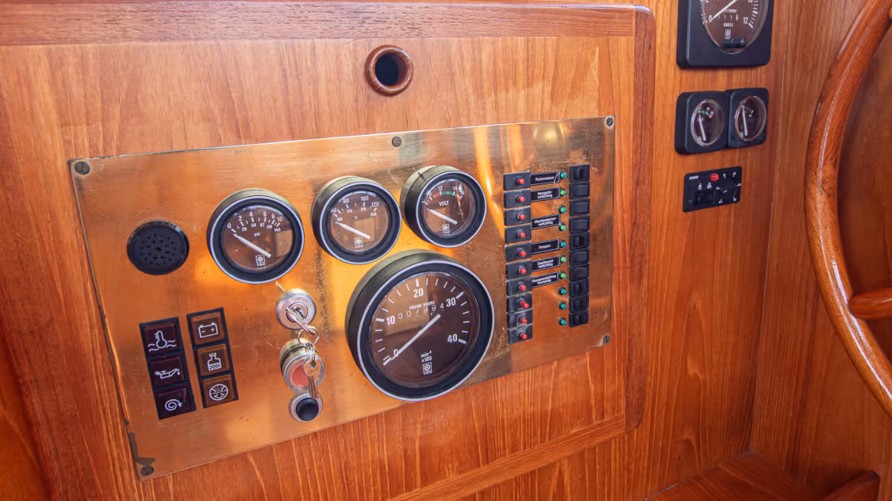 12V and 230V system with Victron isolation transformer. Start battery (140Ah Bosch) and two 180Ah service batteries. Electrical pressure water system supports galley and head.