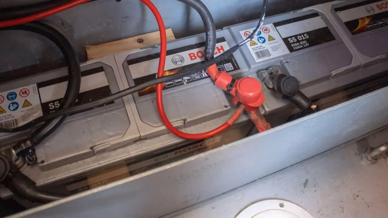 12V DC system with 1x start battery and 2x service batteries (2021), Vetus 30A charger, diode battery combiners (2021), and shore power connection. Bilge, blackwater, and freshwater pumps all renewed in 2022.