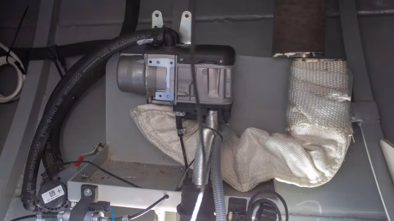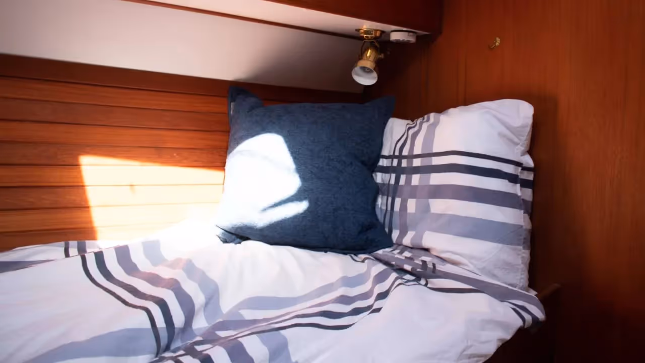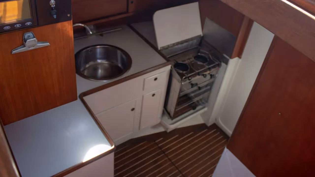 Teak interior with one forward cabin (V-berth) and convertible dinette berth in the pilothouse. Headroom 1.95m. Galley with stainless sink, marble countertop, gas oven and hob, and compressor fridge. Electric toilet and shared shower. Heating via Webasto Thermo Top Evo (2022).