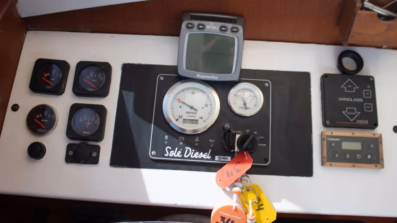 Raymarine autopilot, Tacktick depth/log, compass, Navtex, and navigation lights.