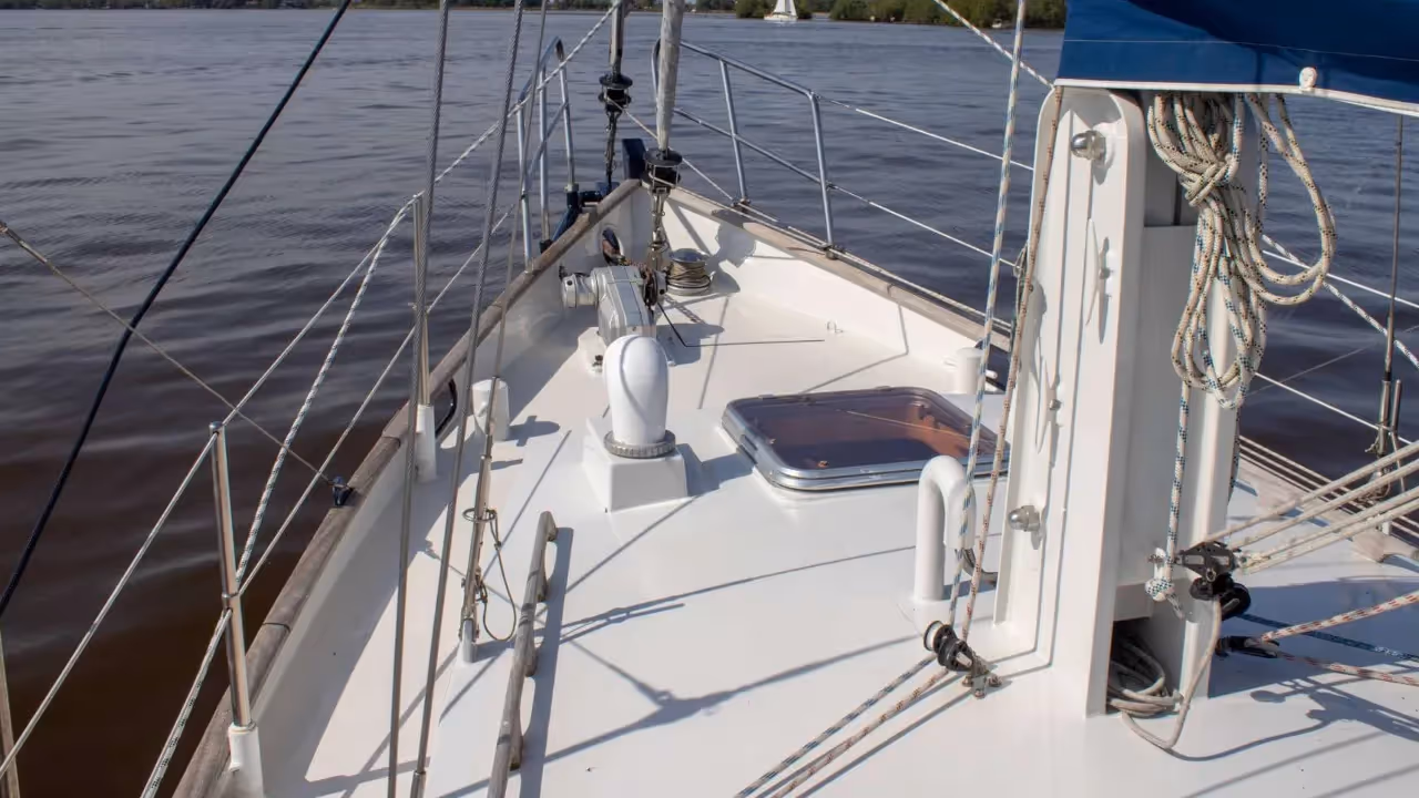 Aluminium decks with non-skid paint finish, teak cockpit sole, and electric anchor windlass with remote and dashboard controls. Stainless-steel bow pulpit, pushpit, and lifelines with side gates. Bimini, mooring lines, and fenders included.