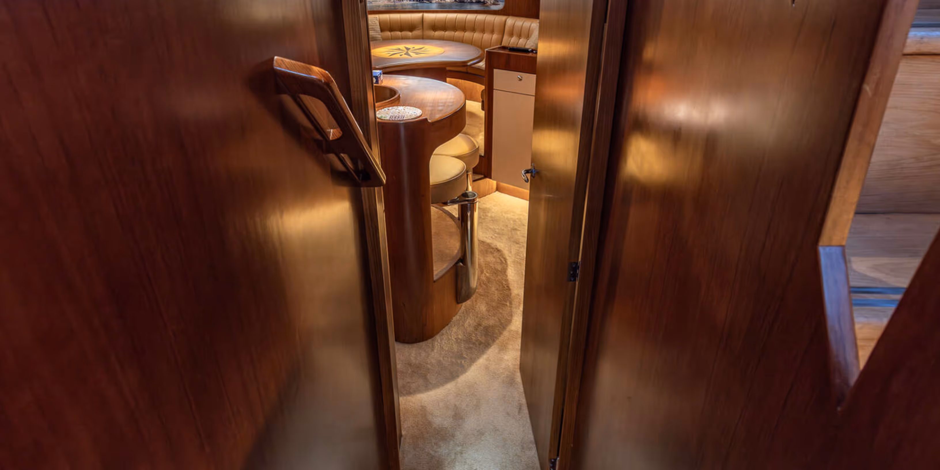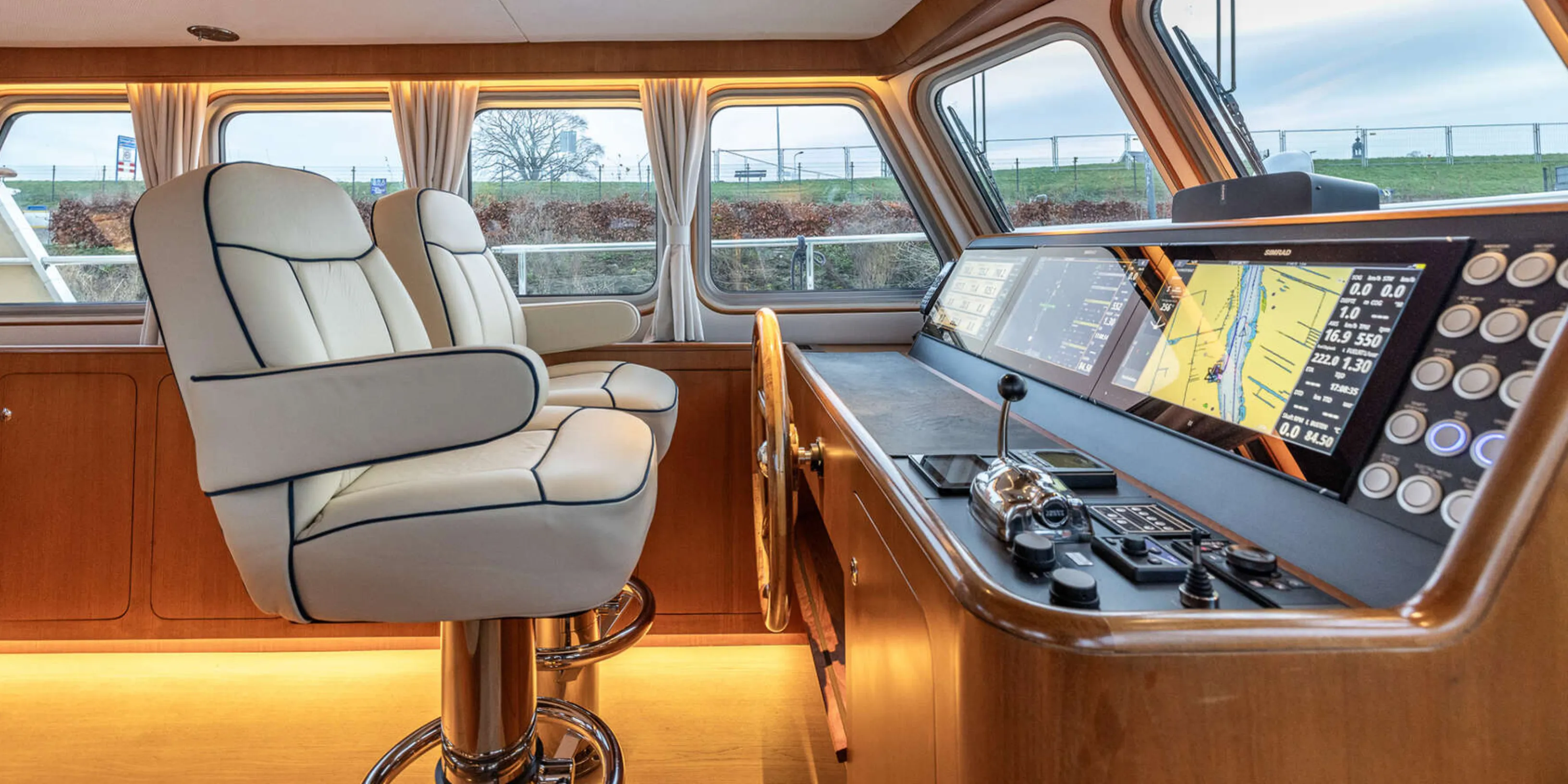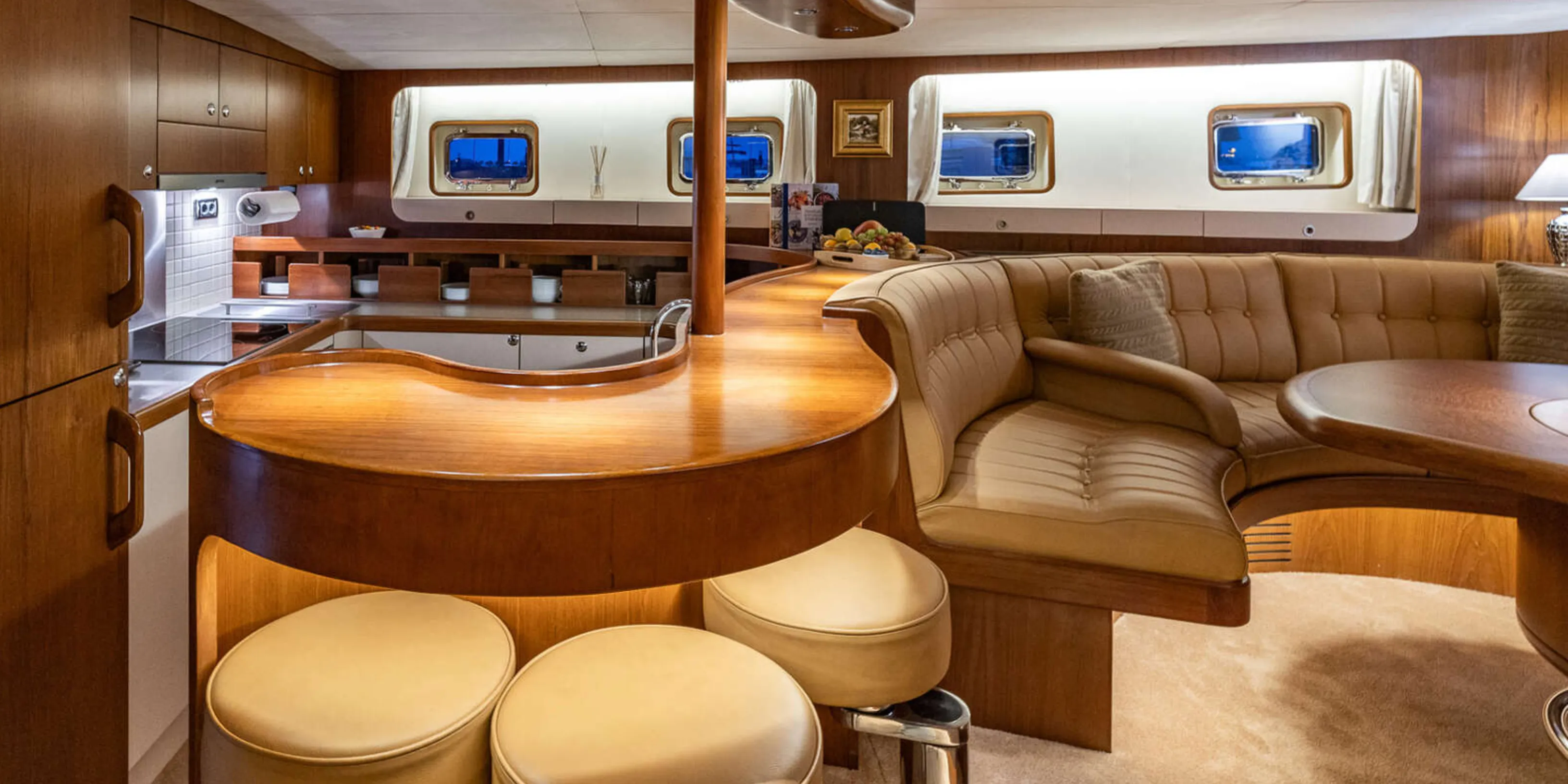 3 cabins, 6 berths. Classic teak interior with pilot house, lower salon, and bar-style galley. Double glazed windows, reverse cycle aircon, floor heating, and electric toilets. Hydraulic outside helm, electric bow thruster, stabilisers (zero speed electric fins), and full Simrad nav suite.