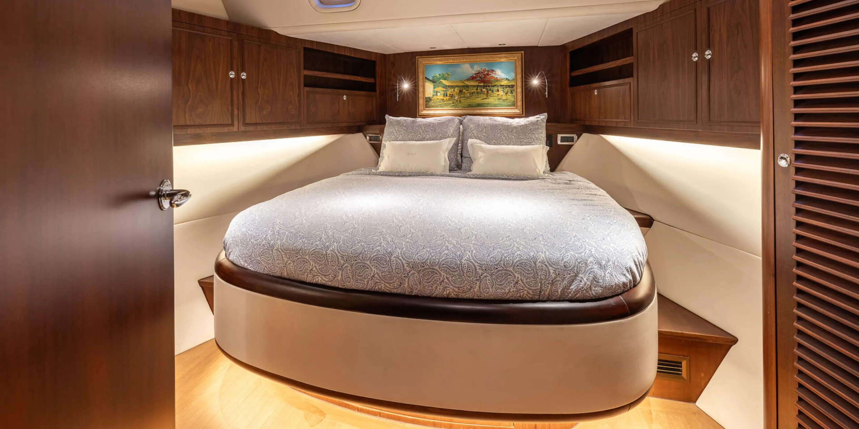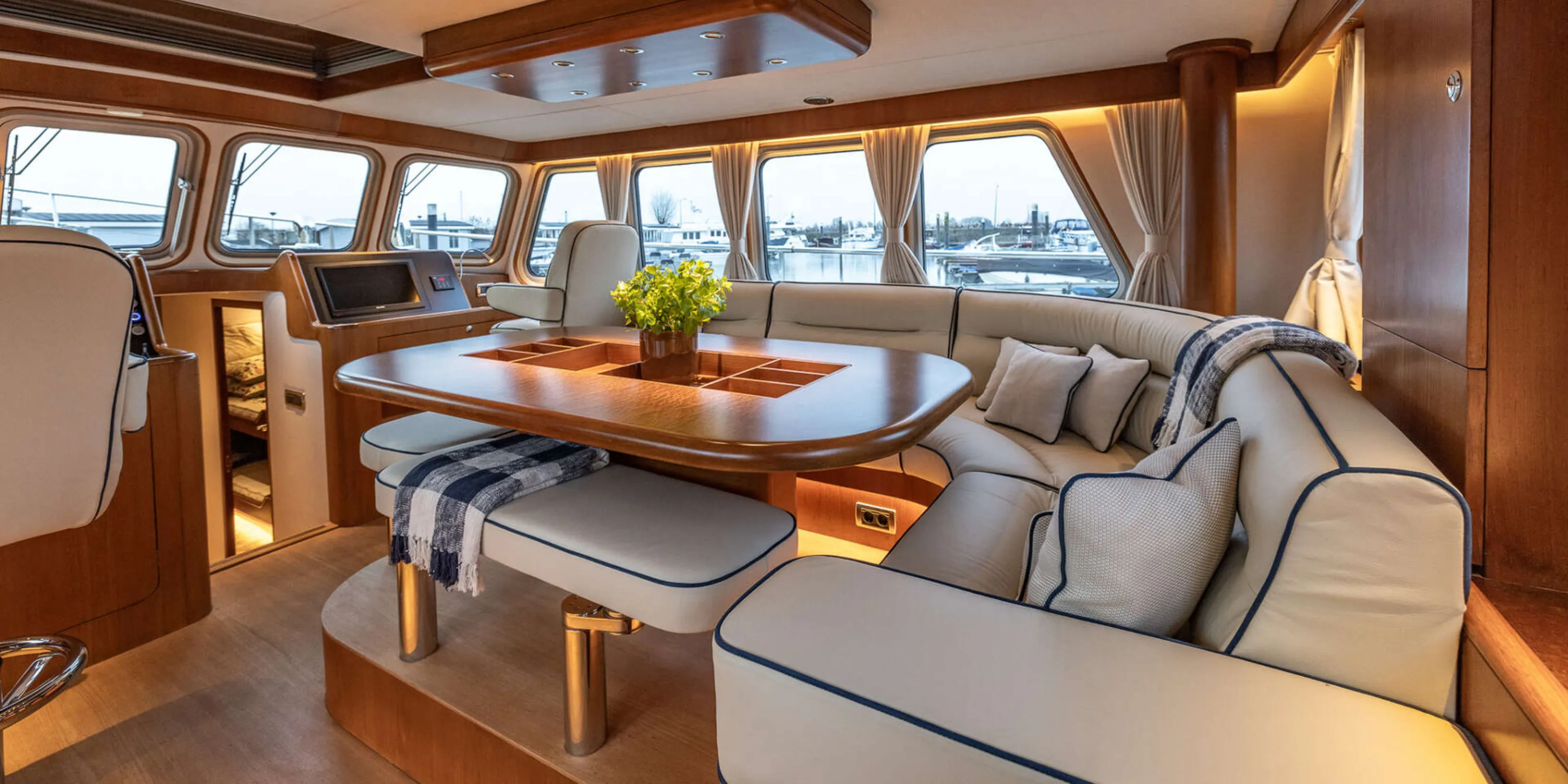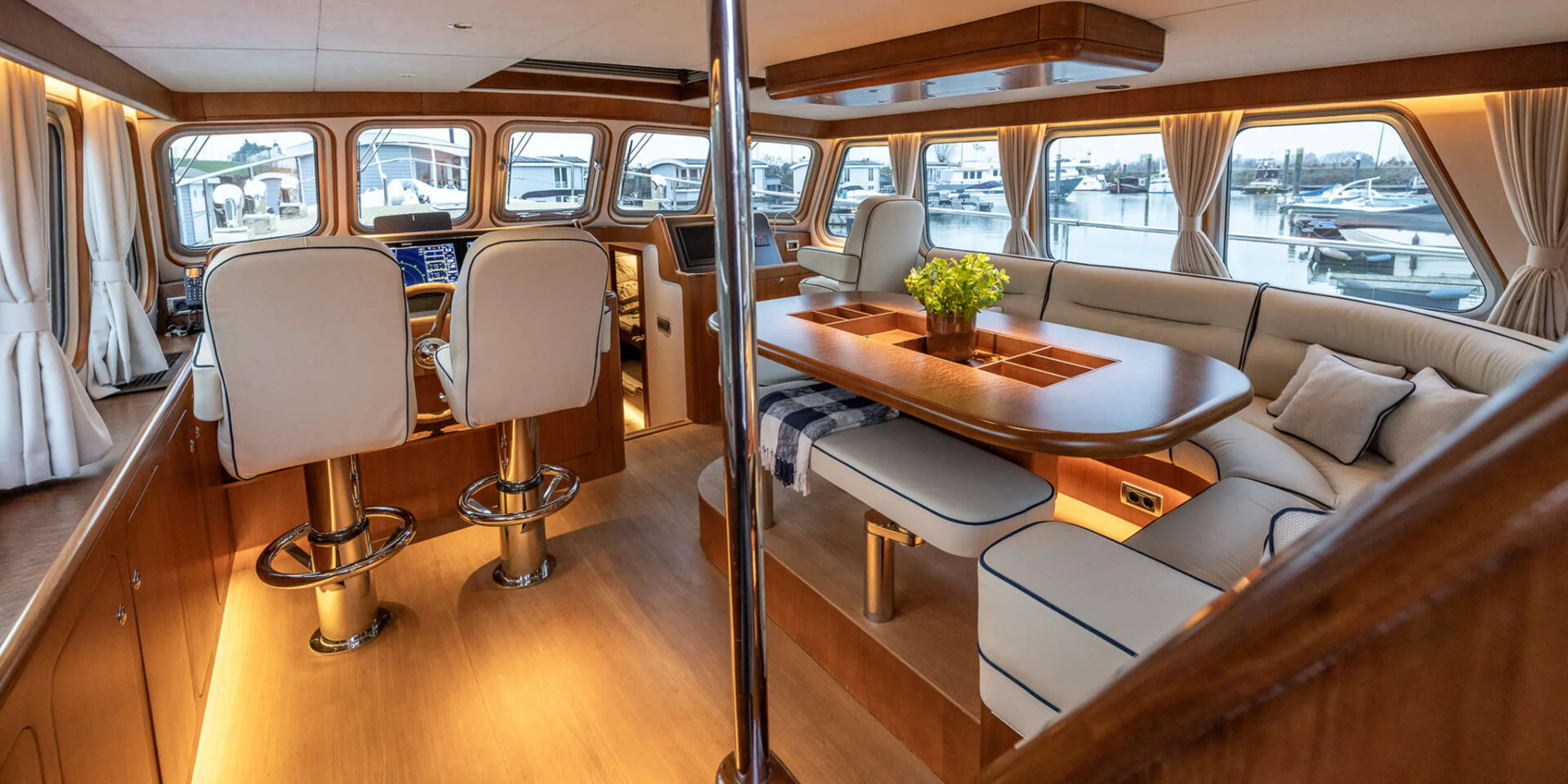 3 cabins, 6 berths. Classic teak interior with pilot house, lower salon, and bar-style galley. Double glazed windows, reverse cycle aircon, floor heating, and electric toilets. Hydraulic outside helm, electric bow thruster, stabilisers (zero speed electric fins), and full Simrad nav suite.