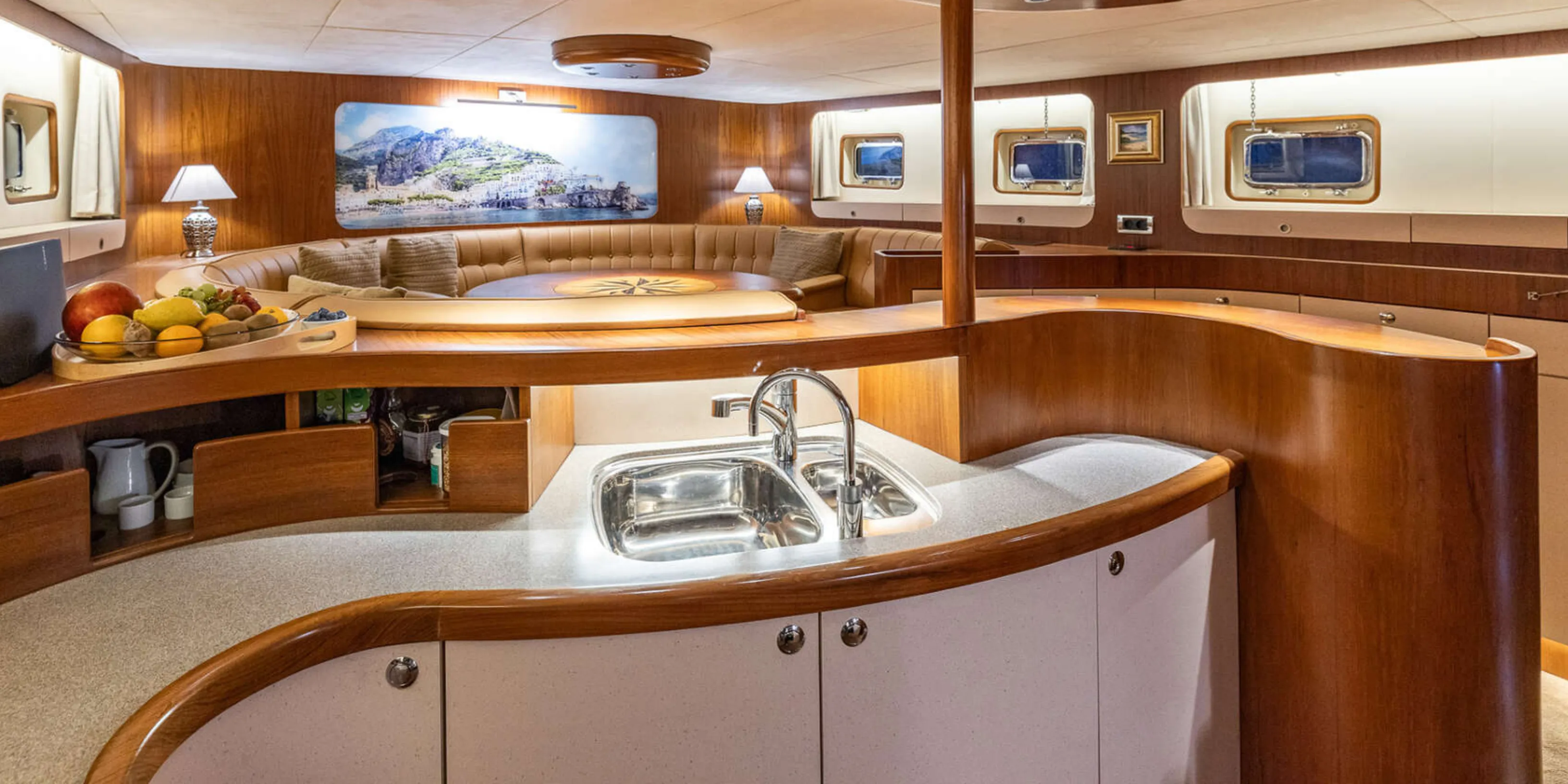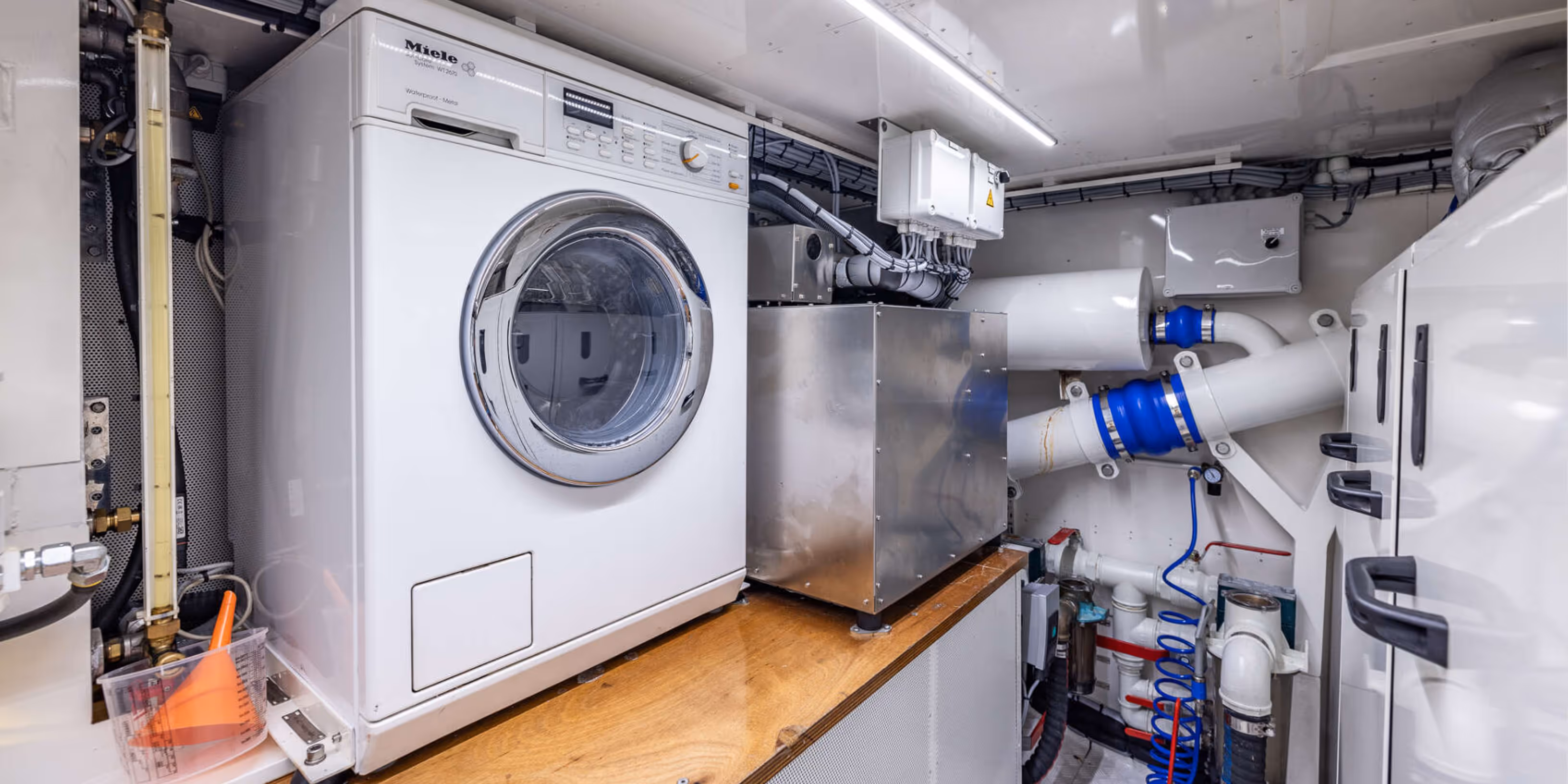 • 3 cabins: Master (French bed), Guest (double), Guest (bunks) • 2 bathrooms (shared for guests, en suite for master) • Miele appliances: induction, oven/micro, fridge, freezer, dishwasher • Washing machine/dryer (Miele WT2670) • Bar seating in lower salon • Dinette and lounging in upper salon