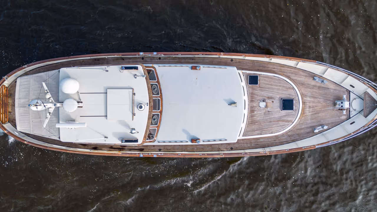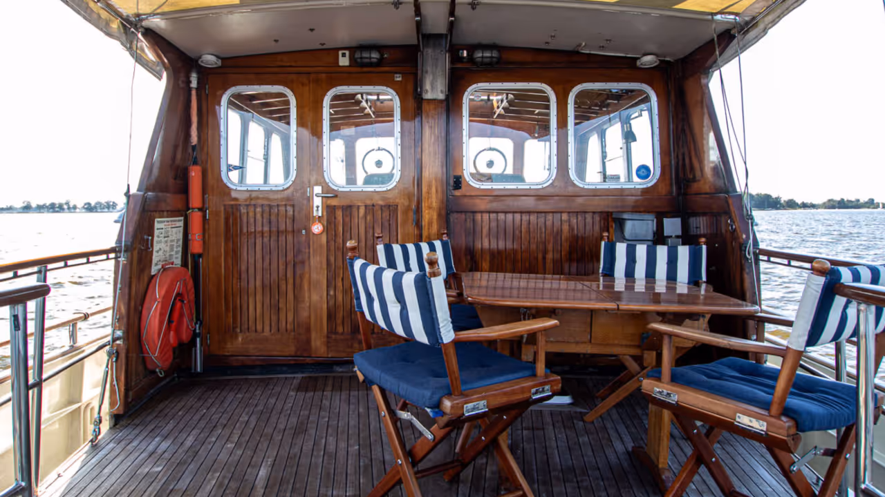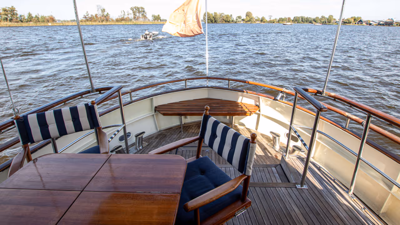 Steel hull with a round bilge and a full-length keel. Decks are laid in teak over steel. Superstructure is wooden, finished in painted coatings. There are 22 copper portholes (18 openable), 2 Gebo deck hatches, and dorade vents for ventilation. The rubbing strake is steel. Window frames are aluminium with glass inserts. All detailing is in traditional Dutch style with a robust finish.