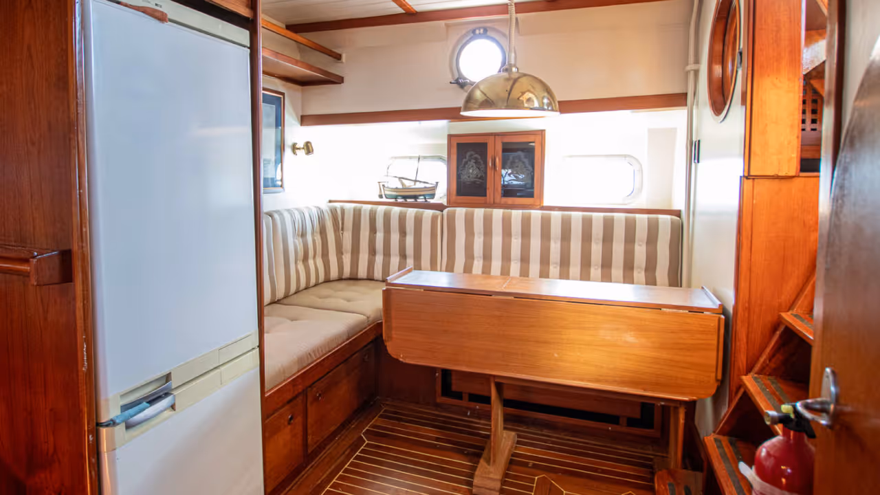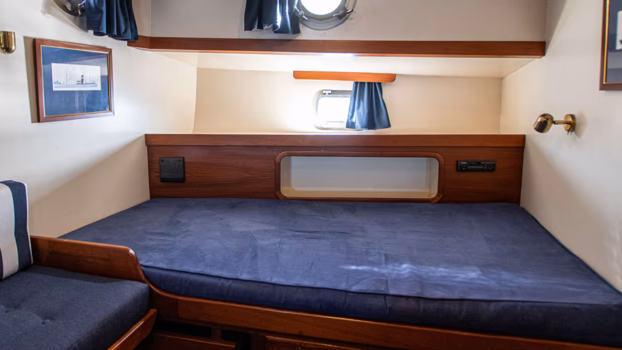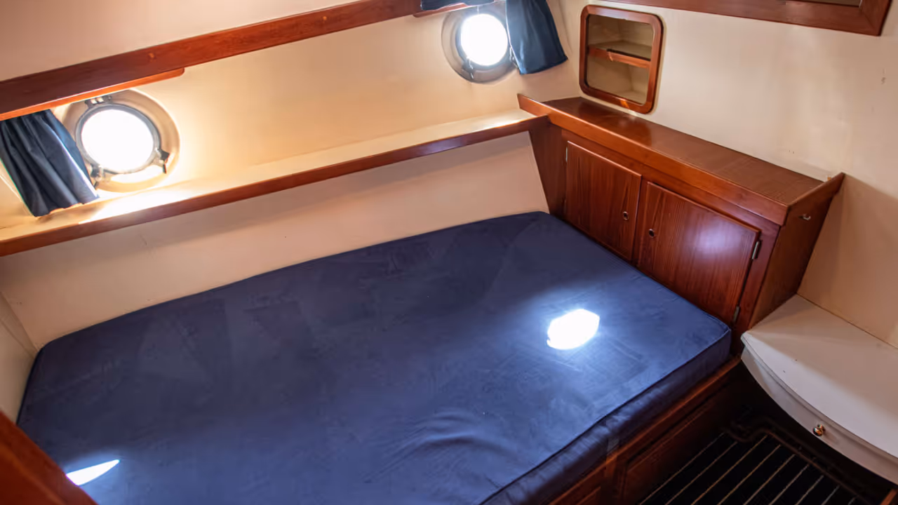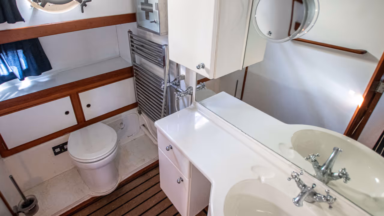 Three cabins sleep six. Aft owner’s cabin with twin singles and en-suite bathroom. Forward guest V-berth cabin, and a midships double guest cabin. Shared guest bathroom with separate shower. Teak interior with central heating, electric toilets (Tecma and Vetus), Bosch fridge/freezer, AEG hob, microwave, washing machine, and stainless steel sink.