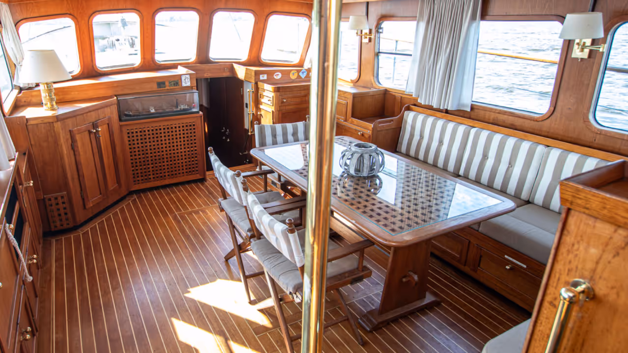 Teak deck finish throughout with stainless steel sea railing and teak grab rails. Manual Francis Marine anchor windlass with chain. Two manual clearview windows, two wipers, fenders, mooring lines, cockpit awning, table, and chairs.