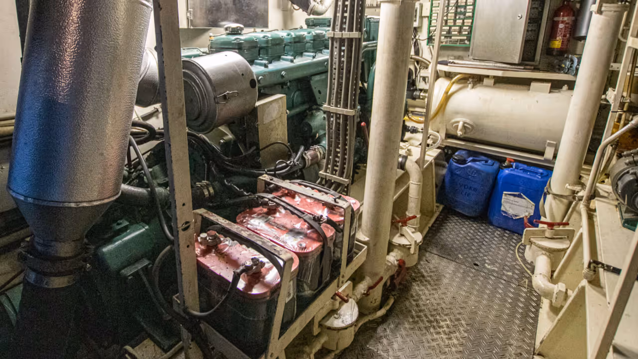 Twin Volvo Penta MD100B 150hp diesel engines on shaft drive with hydraulic gearbox. Freshwater heat exchanger cooling. Hydraulic bow thruster. Stainless steel shafts with fixed props. 10kVA JF Marine generator. Electric bilge pump. Max speed approx. 10 knots.