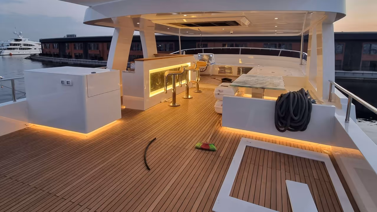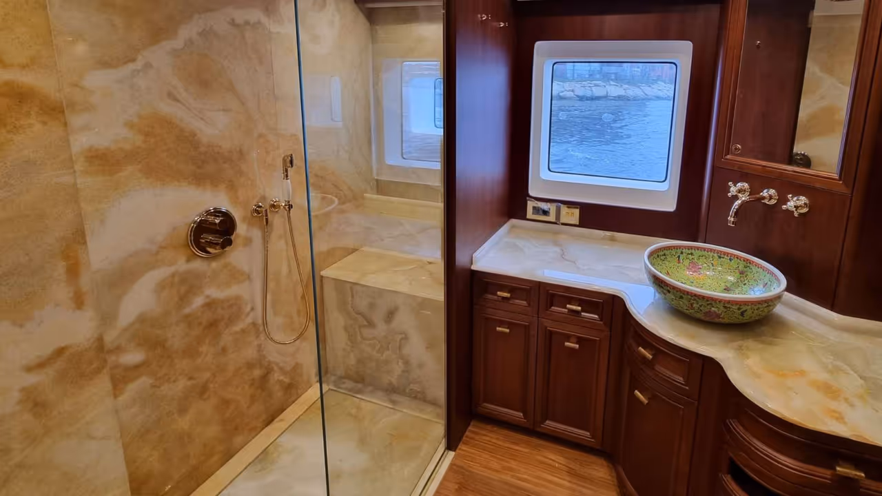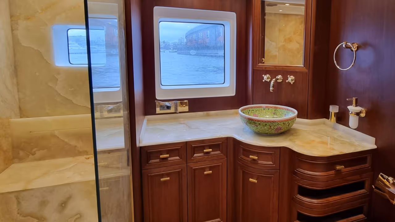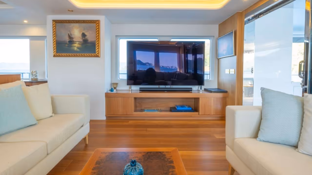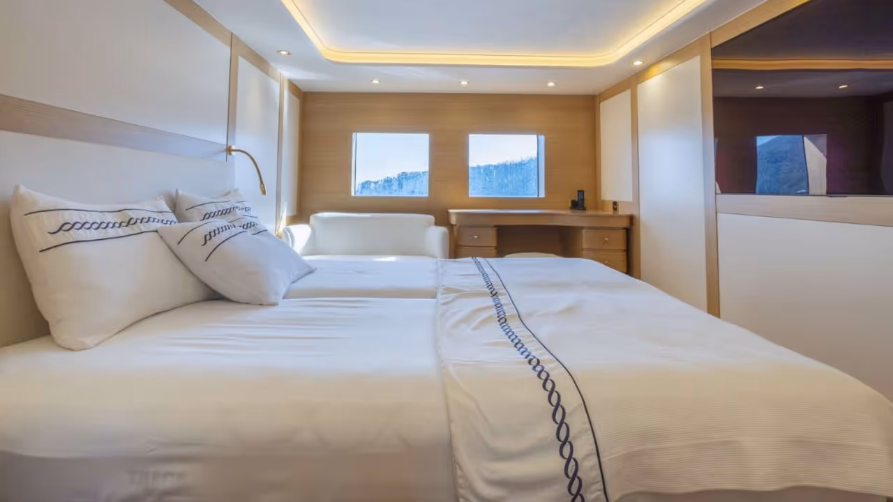 Four guest cabins: full-beam owner’s stateroom, VIP forward, one twin and one single cabin, all with en-suites. Oak interior, wood floors, large windows throughout. Crew area aft with two berths and a dedicated head. Fully equipped galley with Siemens appliances, induction cooking, and corian worktops.