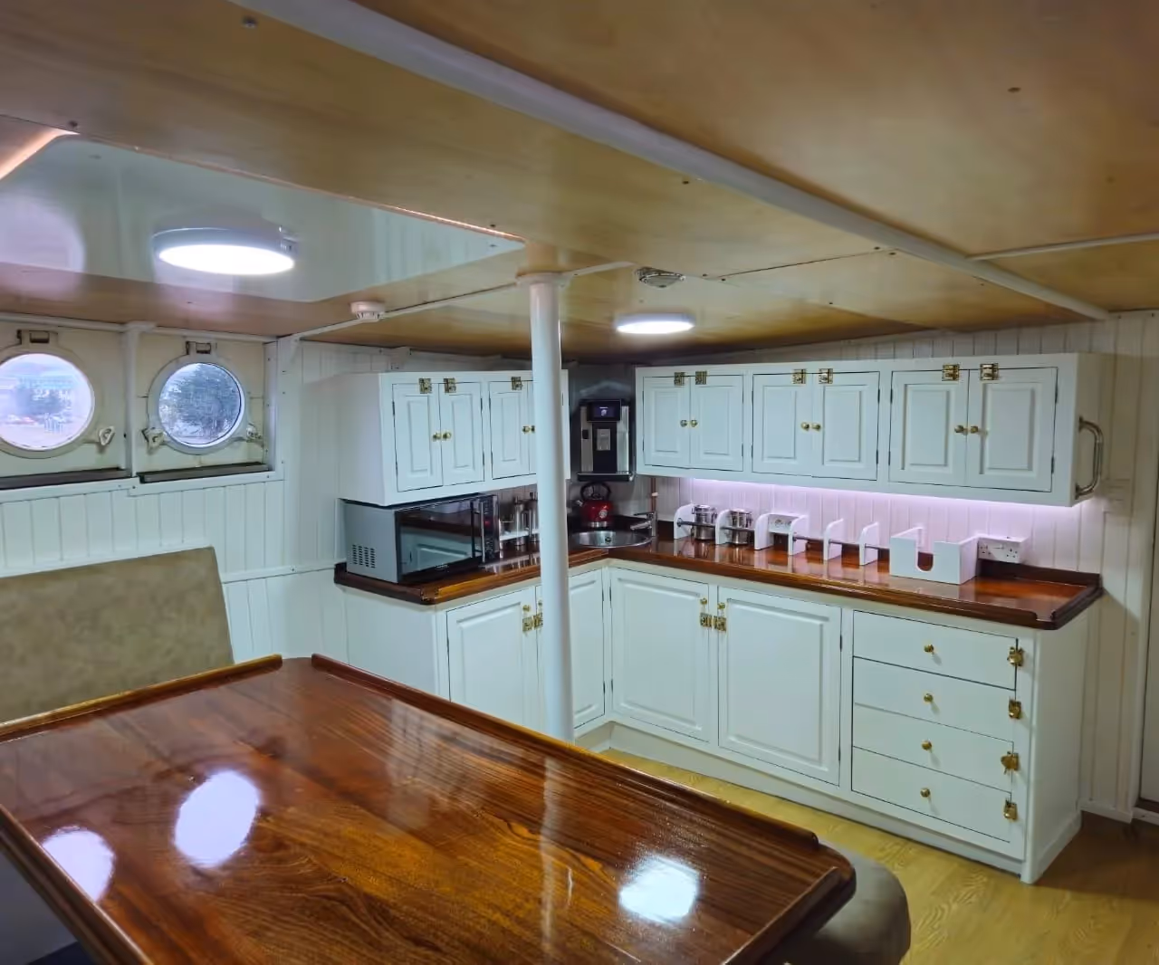 The vessel features a modern electrical system with 220V outlets, onboard generators, and all standard lighting, heating, and safety systems required for Antarctic voyages. Communications and navigation equipment are fully integrated and updated.