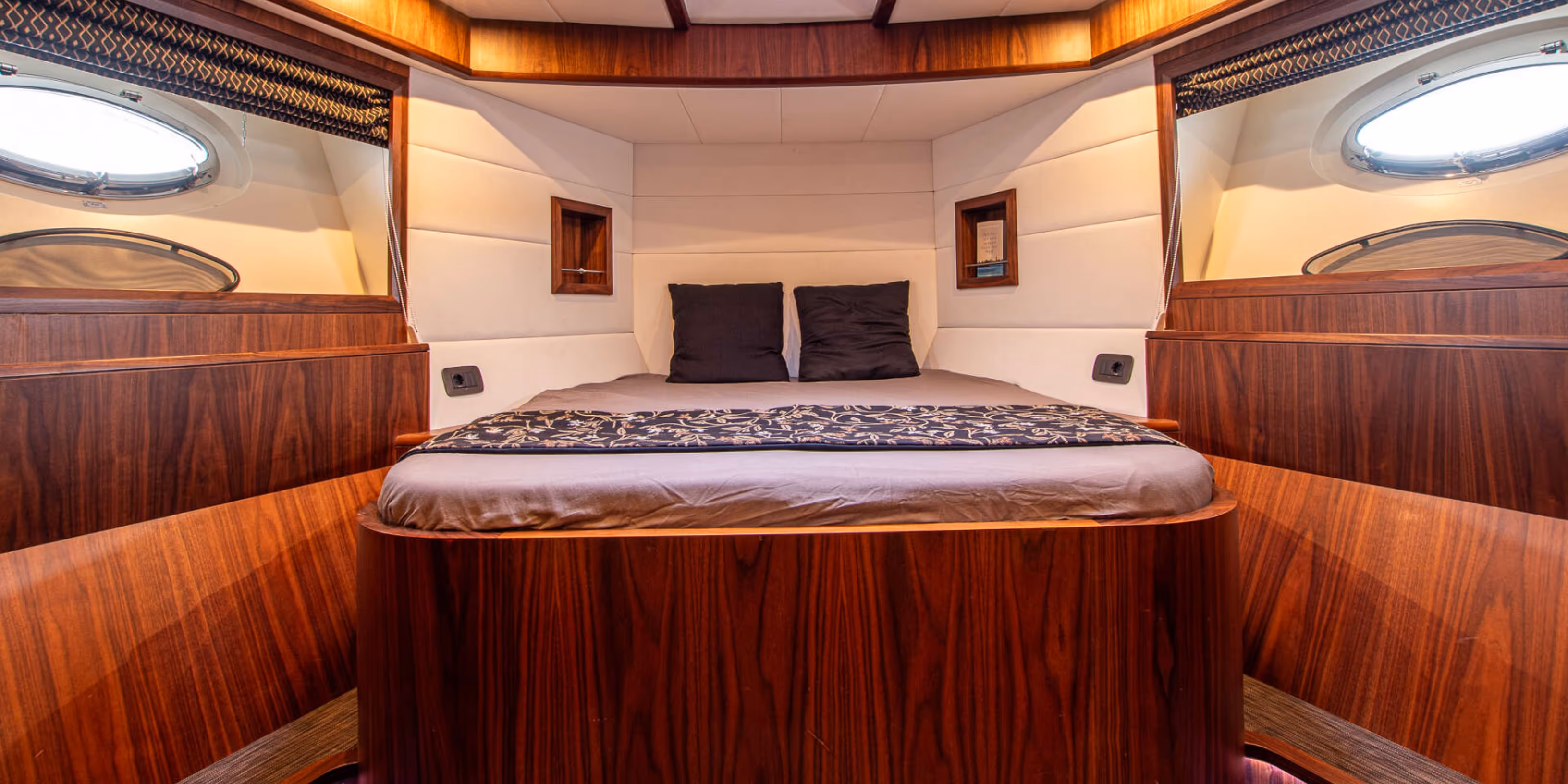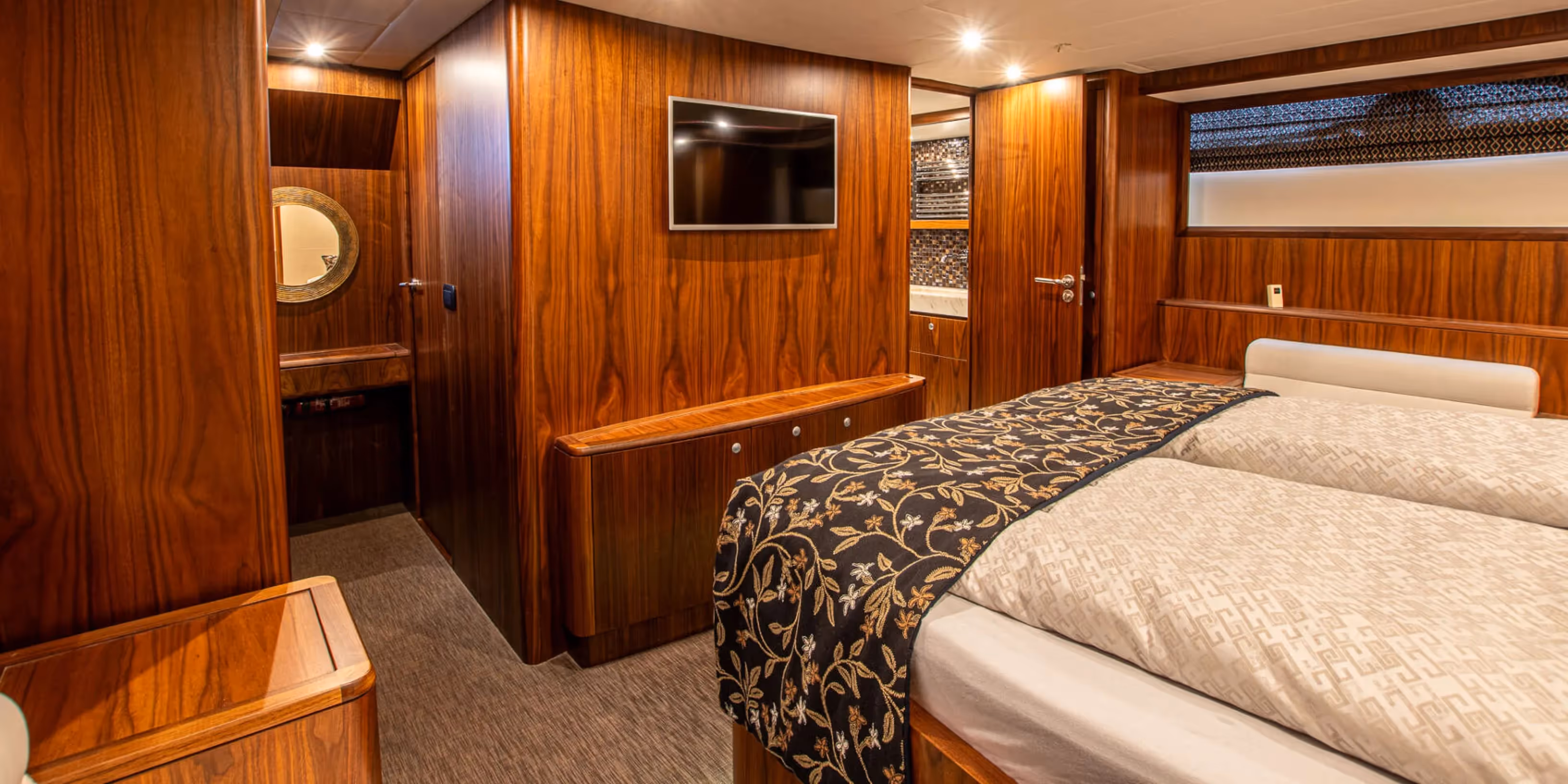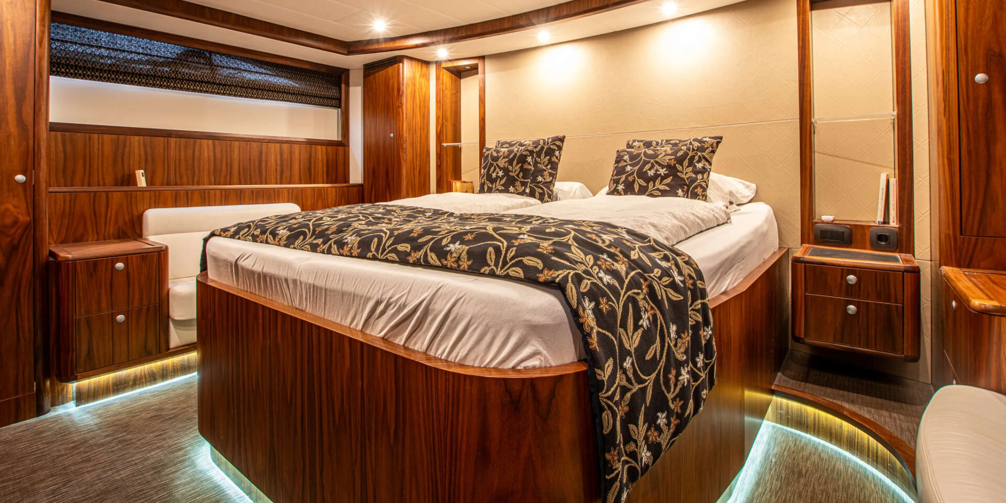 Accommodation is arranged in a deck saloon configuration with two cabins sleeping four guests. The full beam owner’s cabin aft features a double berth, en suite bathroom, and generous storage. The forward guest cabin also offers a double berth with its own en suite facilities. Interior finishes include black walnut joinery, granite and Corian surfaces, underfloor heating throughout, and high quality Miele galley appliances.