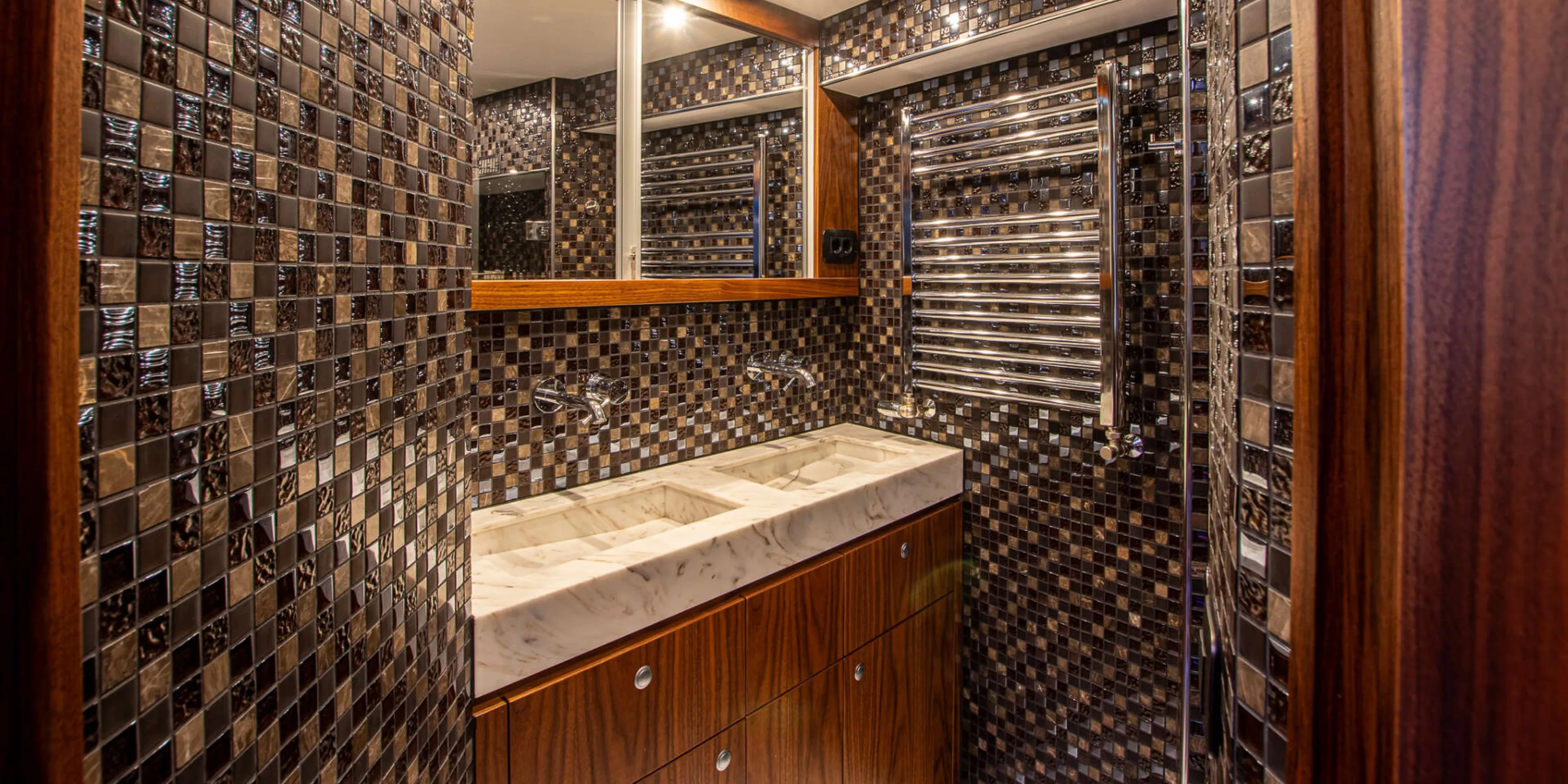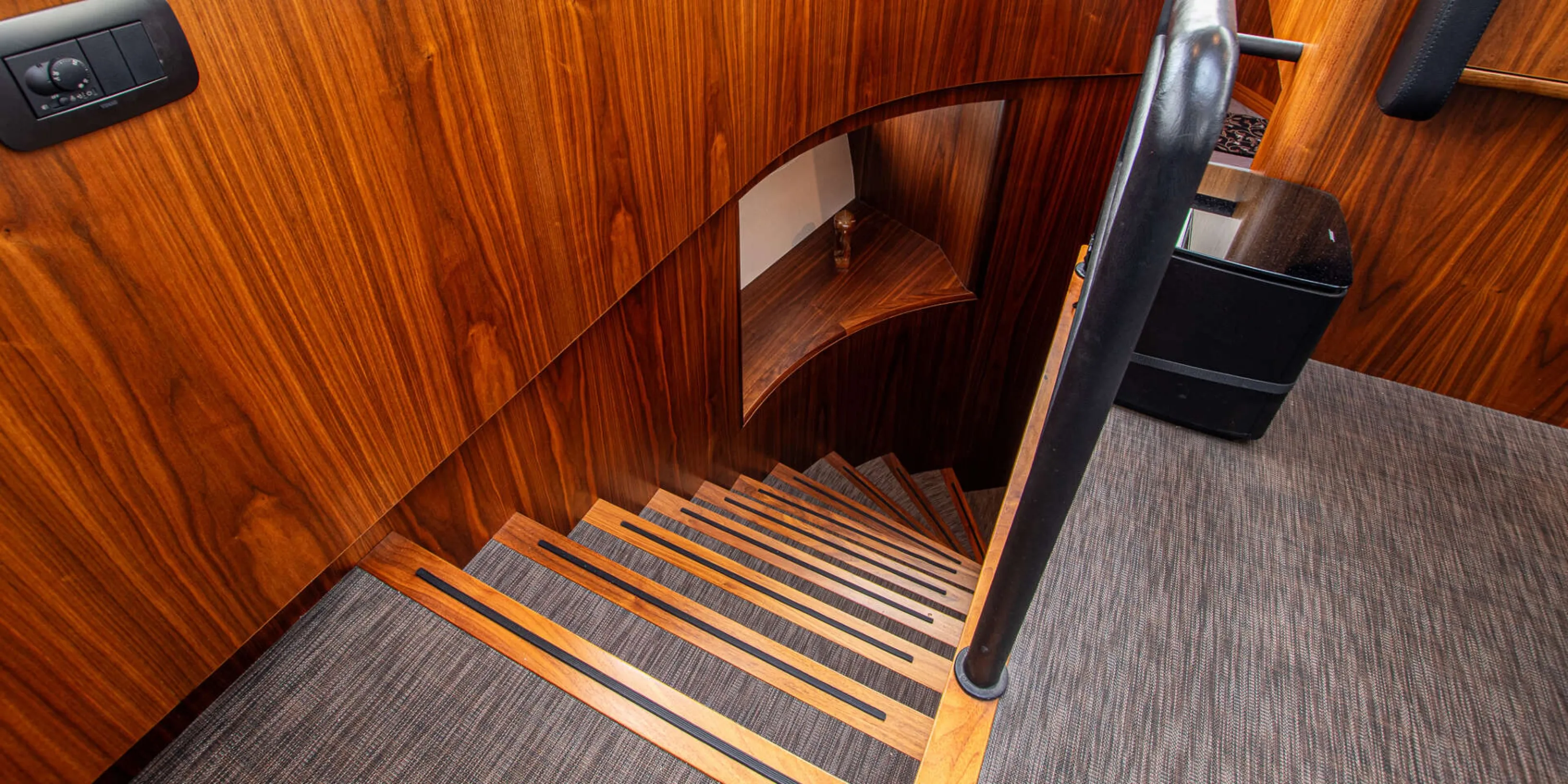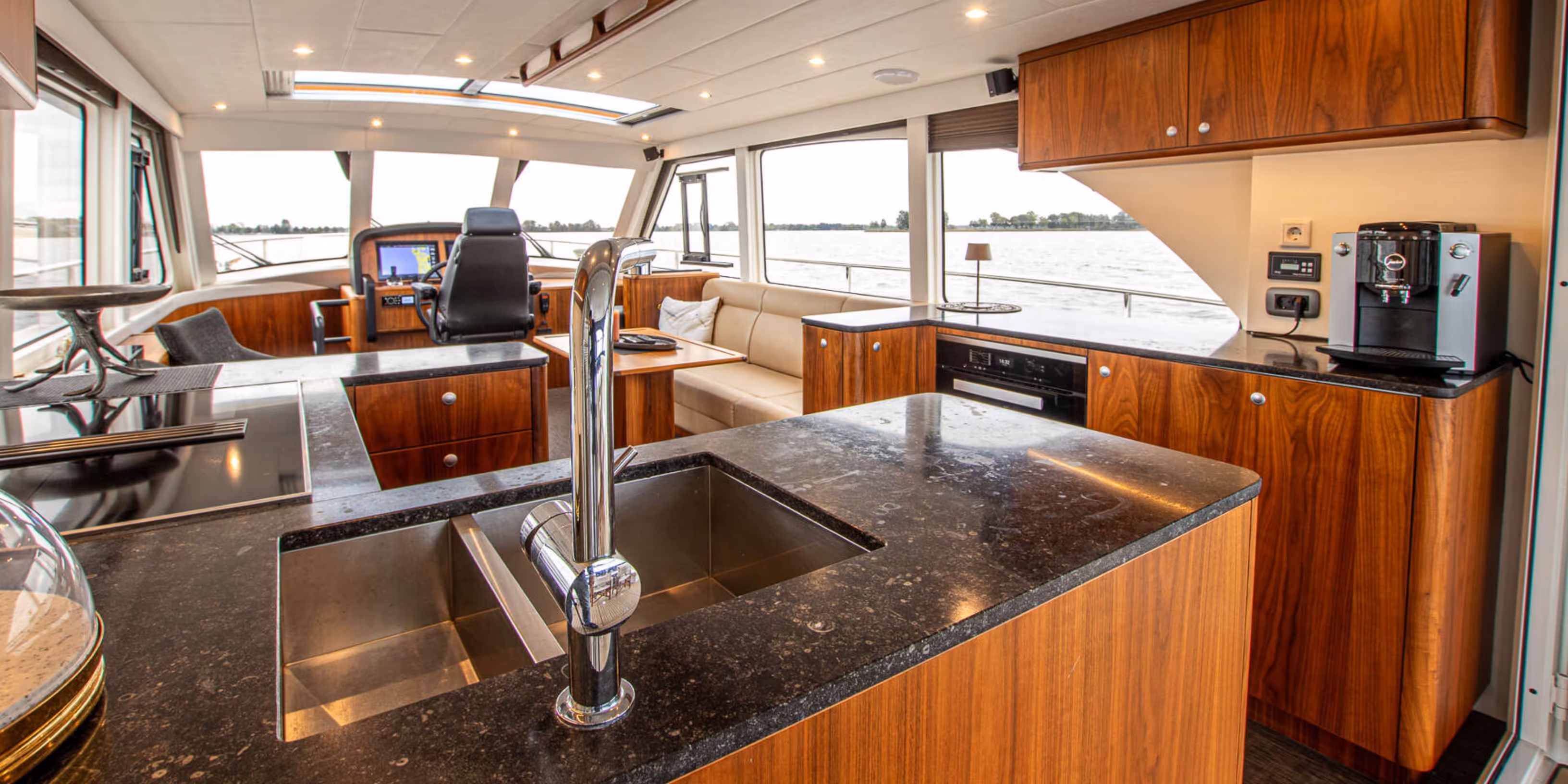 Accommodation is arranged in a deck saloon configuration with two cabins sleeping four guests. The full beam owner’s cabin aft features a double berth, en suite bathroom, and generous storage. The forward guest cabin also offers a double berth with its own en suite facilities. Interior finishes include black walnut joinery, granite and Corian surfaces, underfloor heating throughout, and high quality Miele galley appliances.
