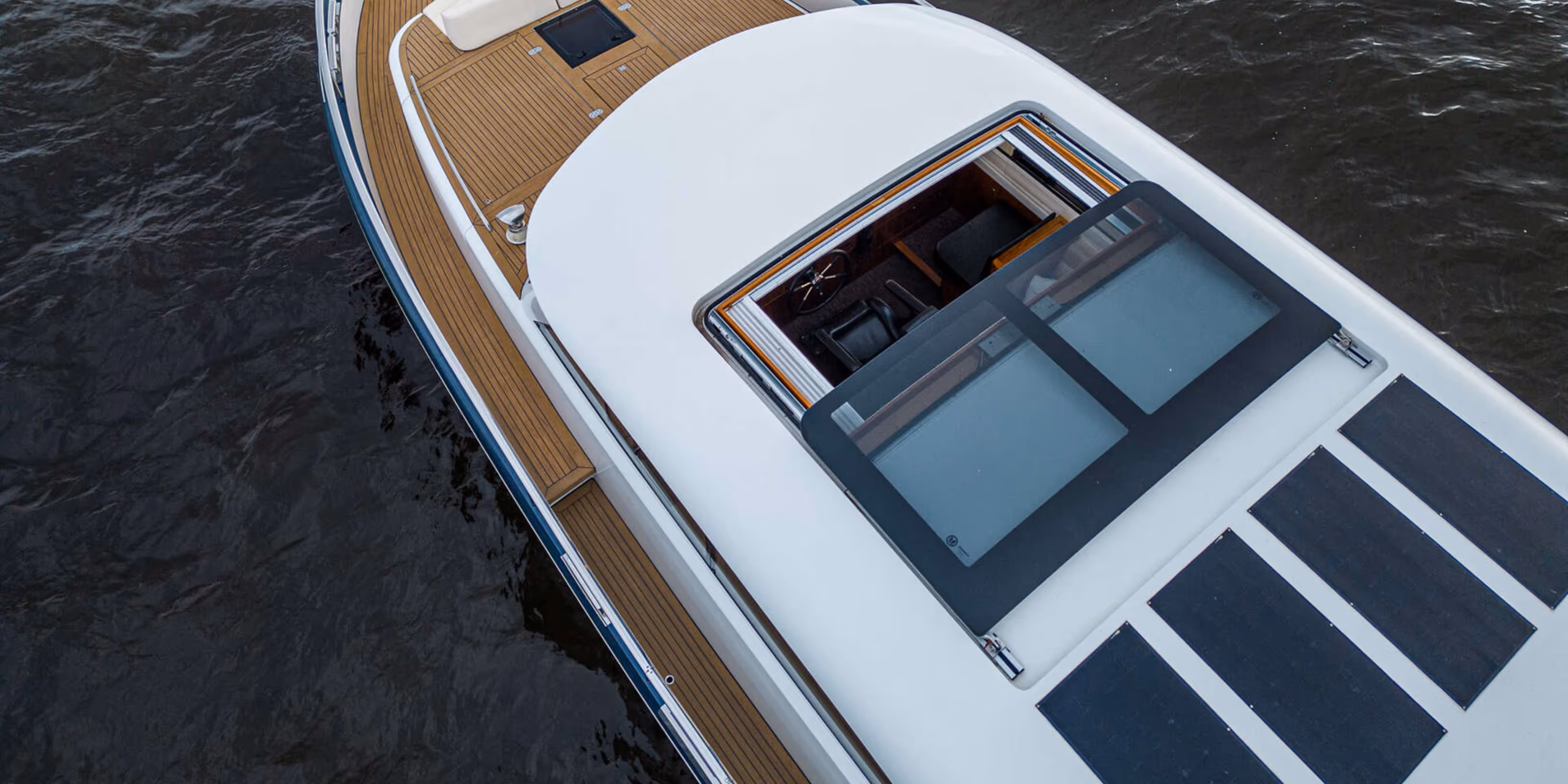 The exterior decks are designed for safe and easy movement, with stainless steel railings and wide side decks. The foredeck offers generous space for seating and deck equipment, while the cockpit provides sheltered outdoor seating with direct access to the saloon via full width folding doors. A bathing platform and stainless steel boarding ladders allow easy access to the water.