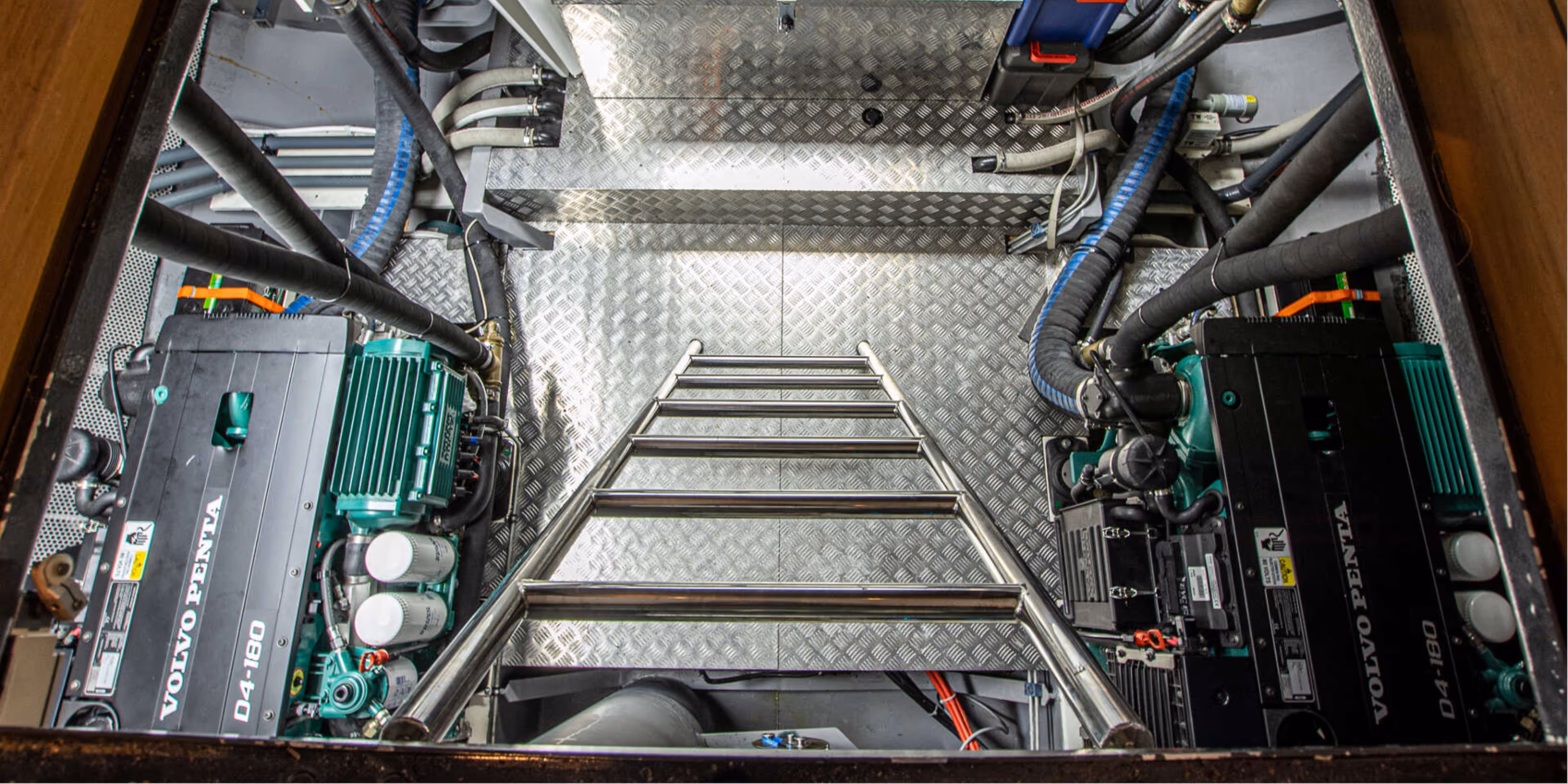 Propulsion is provided by twin Volvo Penta D4 180 horsepower diesel engines driving shaft lines, offering reliable and efficient displacement speed cruising. Manoeuvrability is enhanced by electric bow and stern thrusters, joystick control, and spud poles fitted both forward and aft. The yacht is equipped with DMS Magnus Master stabilisers, providing effective roll reduction at low speeds and at anchor. A Whisper Power generator supplies onboard electrical power when away from shore.