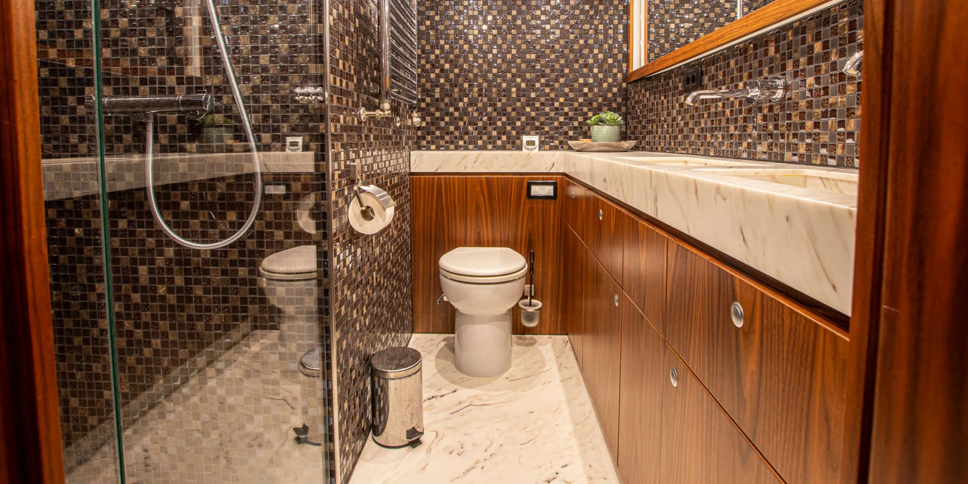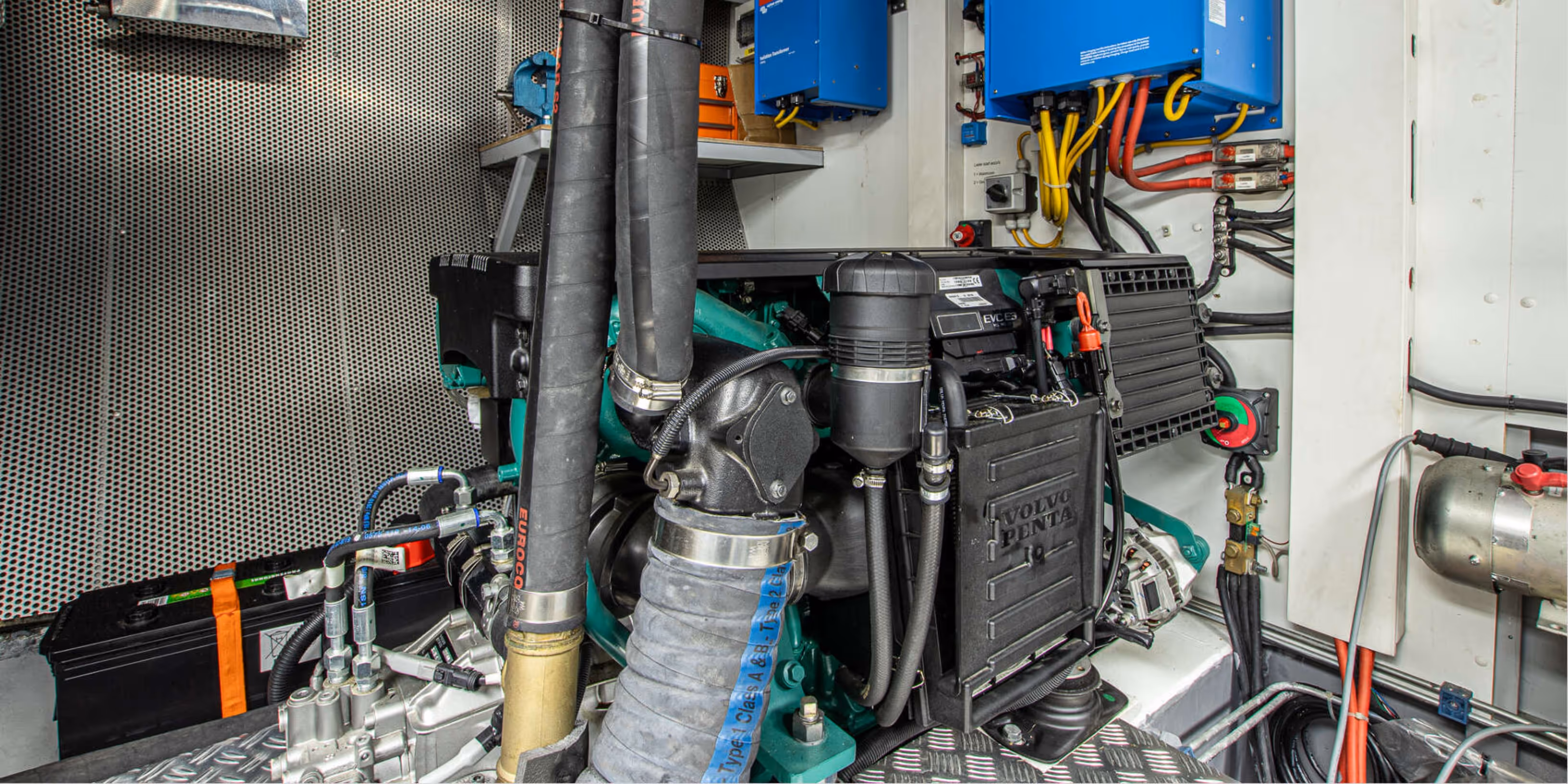 The electrical system is based around a 12V, 24V, and 230V configuration, supported by a Victron Quattro inverter charger system. Shore power connections are available both forward and aft, allowing flexible mooring arrangements. Solar panels supplement battery charging, and all systems are monitored via the Yachtcontrol system, which allows remote monitoring and control.