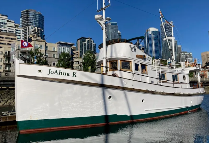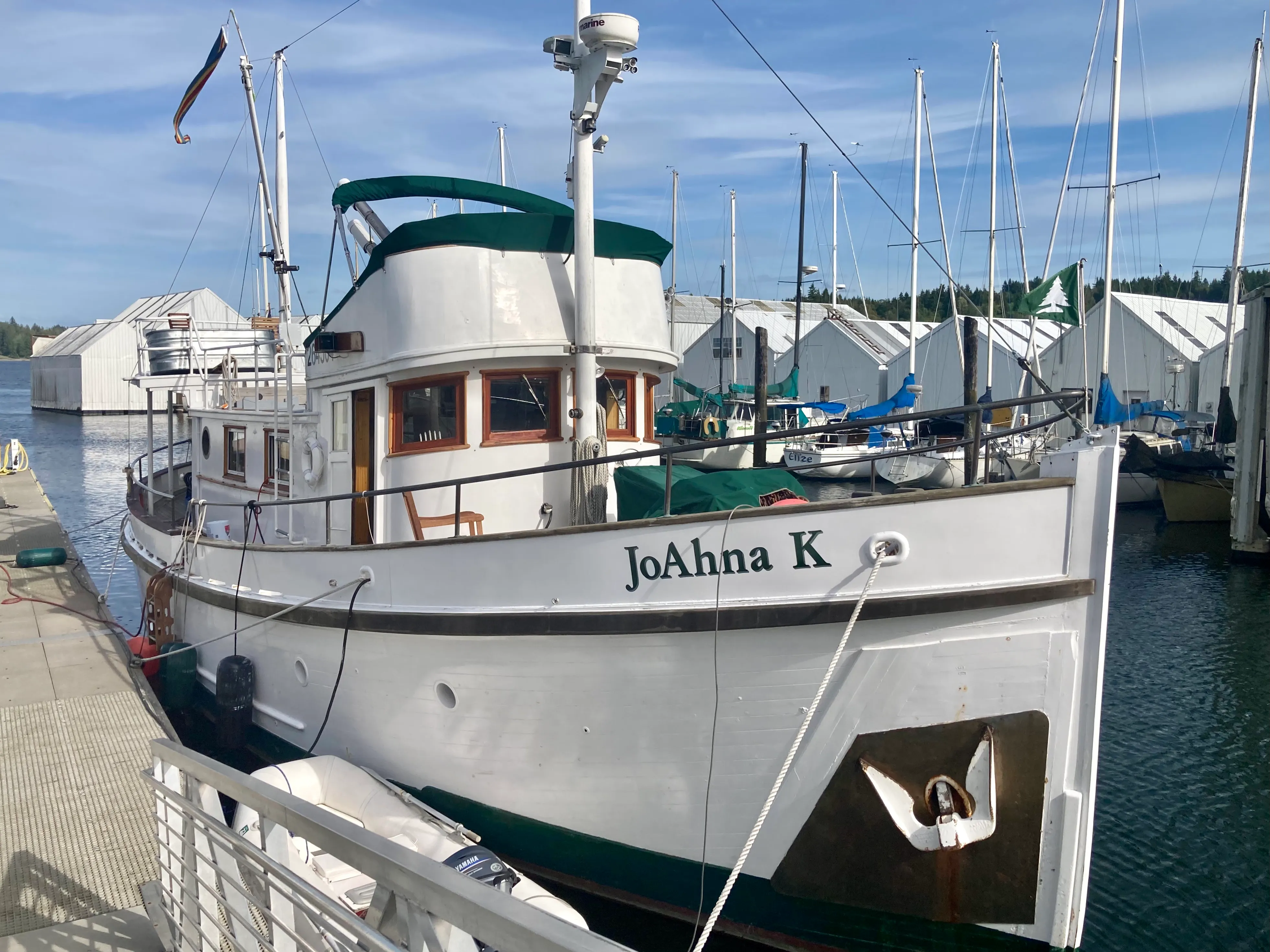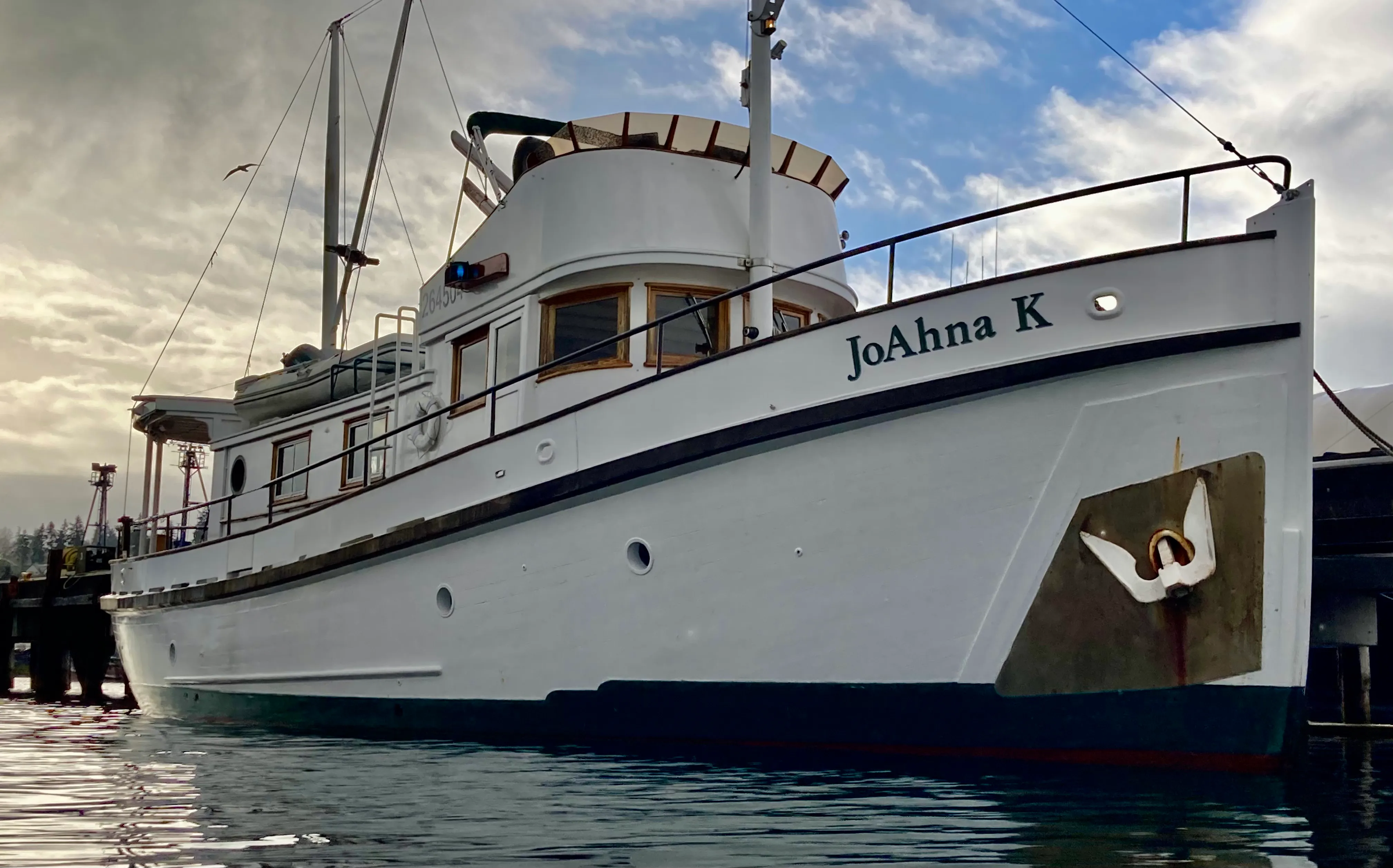Built in 1952 by Fellows & Stewart in San Pedro, JoAhna K is a 58-foot heavy timber motor yacht designed by William Garden. Originally commissioned for long-range exploration, she carries 3,200 gallons of fuel and 800 gallons of water, offering a true passagemaking range of over 4,000 nautical miles. Her story includes Hollywood origins, two decades of Alaskan charter service, and extensive professional restoration. A major refit in 2002 (costing over $750,000) included twin John Deere Lugger diesels, a Northern Lights generator, Hurricane hydronic heat, updated electrical systems, modern electronics, new shafts, props, plumbing, and three VacuFlush heads. A later fire was contained, and the yacht underwent another 1.5-year professional rebuild that restored her.