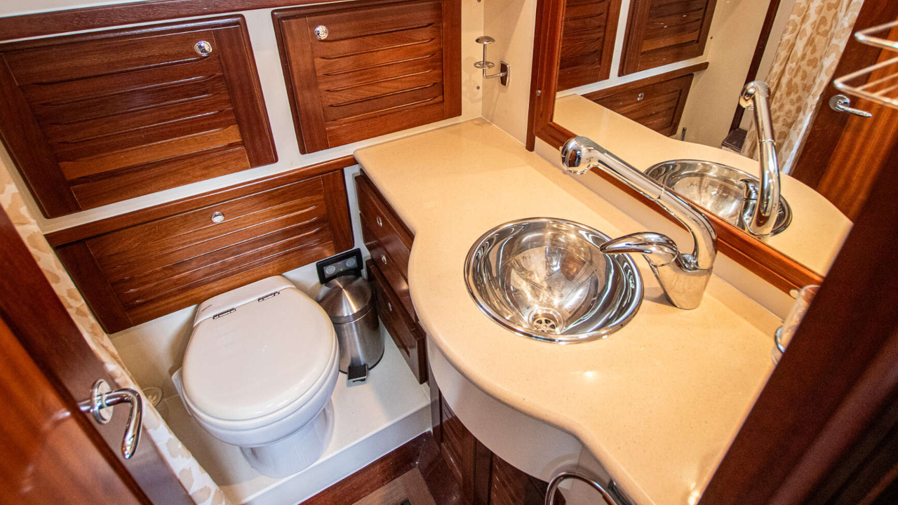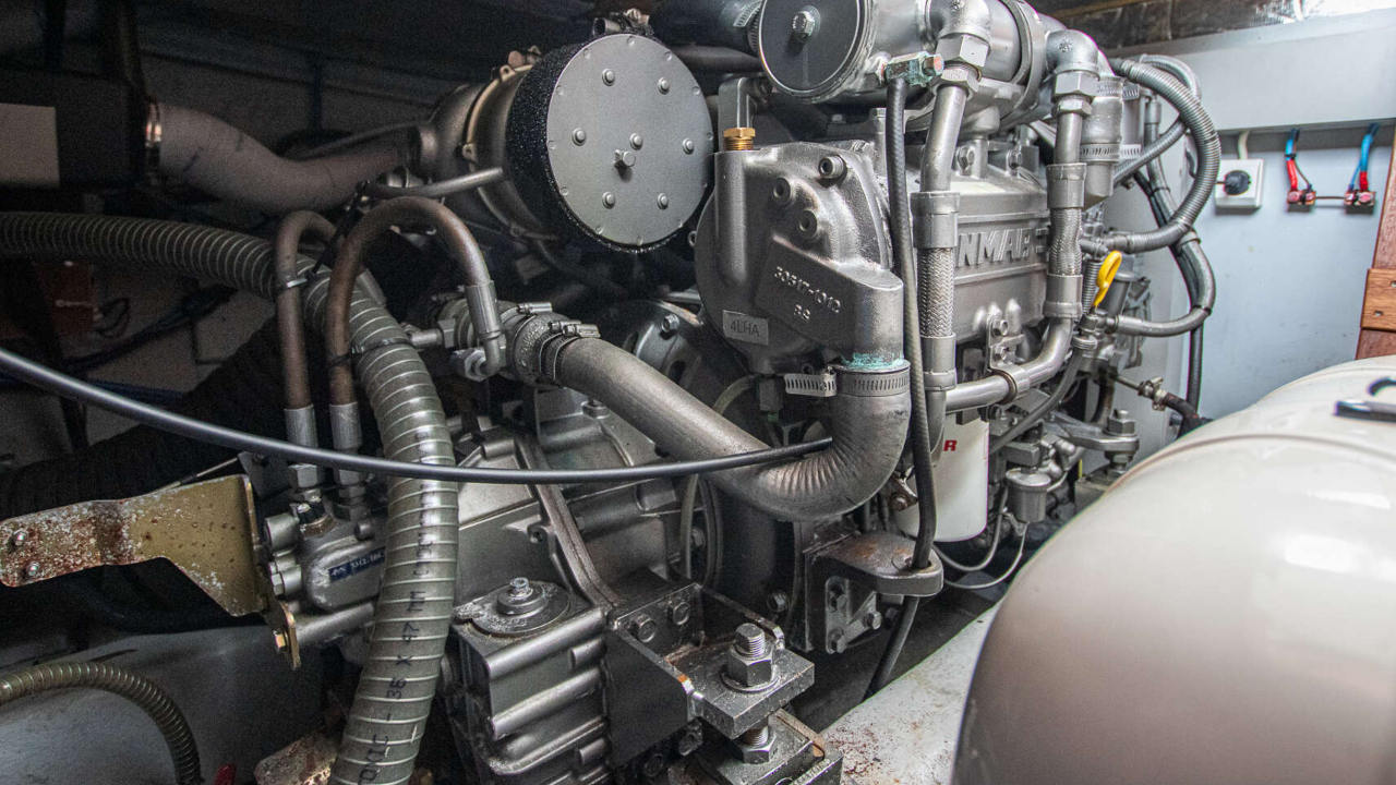 Twin Yanmar 4LHA STP 240 hp diesels. Shaft drive with stainless prop shafts, fixed four blade propellers and water lubricated bearings. Sidepower bow thruster. Mastervolt Whisper 6000 generator with 138 hours. Webasto diesel heating and Crusair reverse cycle air conditioning. Electric bilge pumps with alarms. Engine hours approx 358 and 369.