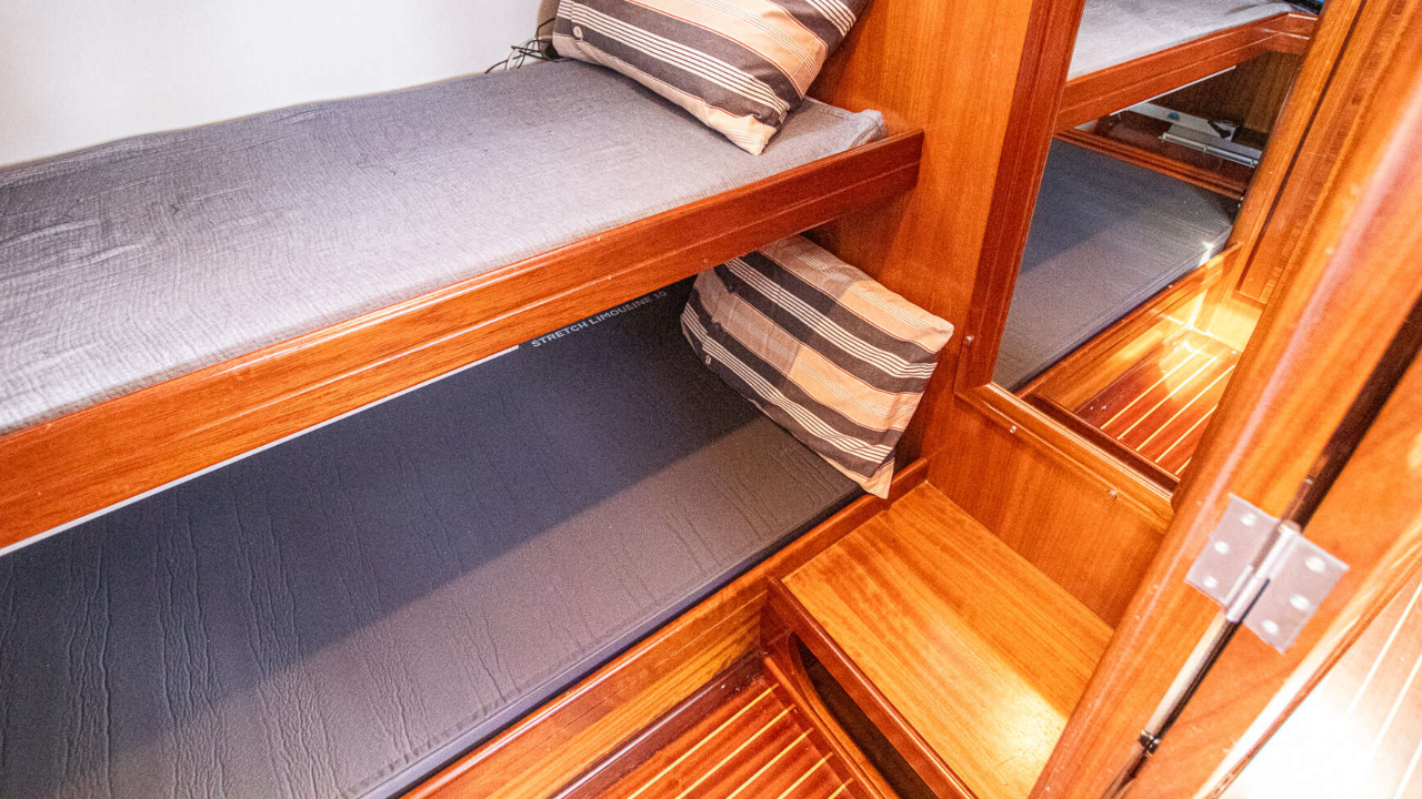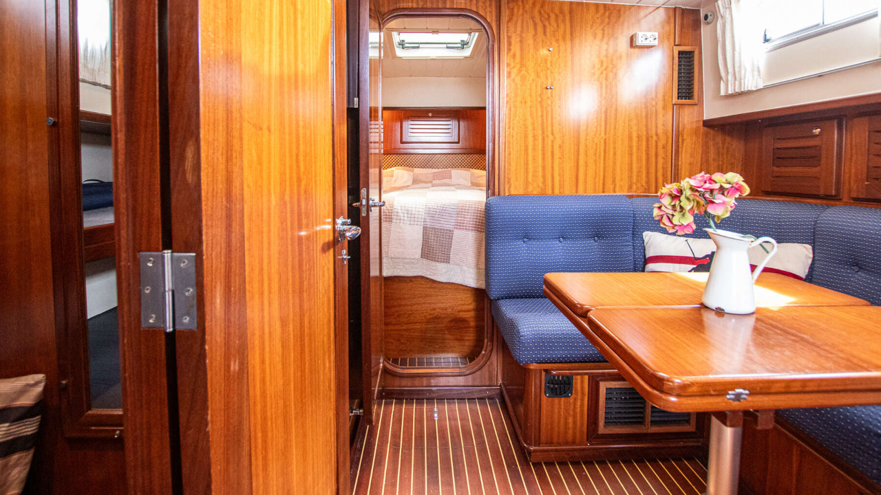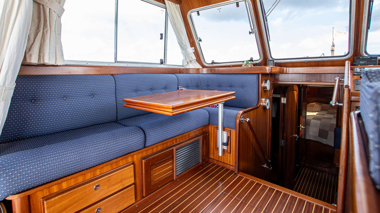 Two cabin layout with forward owners cabin featuring a French berth, hanging lockers and storage. Guest cabin with twin berths. Shared bathroom with electric toilet, basin and shower. Convertible dinette in saloon. Galley with corian worktop, double stainless sink, electric two zone cooker, combi microwave and twin Indel B fridges. Teak interior with ample seating and wheelhouse visibility.
