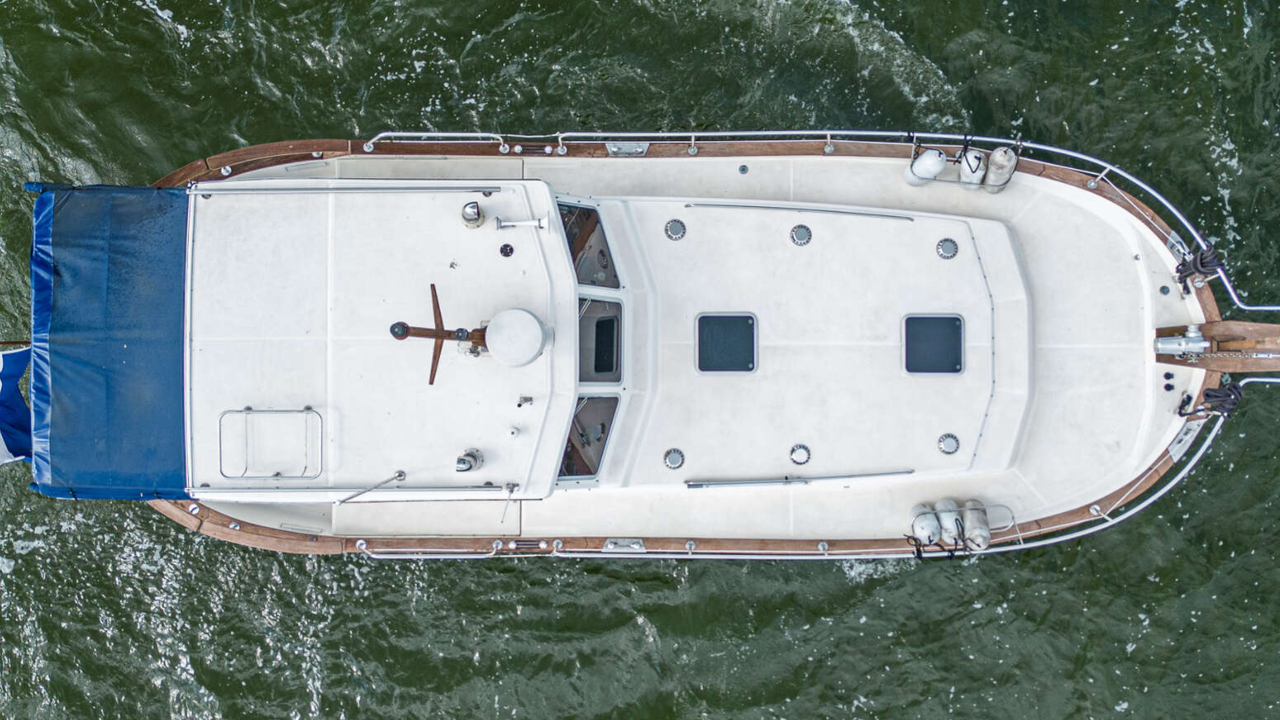 Built in GRP with a full bodied semi displacement hull, the design uses a rounded forefoot for soft entry and a long run aft for stable tracking. Structural bulkheads and GRP stringers provide rigidity. Exterior teak cap rails and trim are used throughout. Non skid decks offer secure footing and the wheelhouse uses aluminium framed glazing for durability. Systems include stainless steel fuel tanks, polyethylene freshwater tank, electric bilge pumps, dry exhaust generator and dedicated bow thruster battery bank. The build prioritises reliability, ease of upkeep and seakeeping.