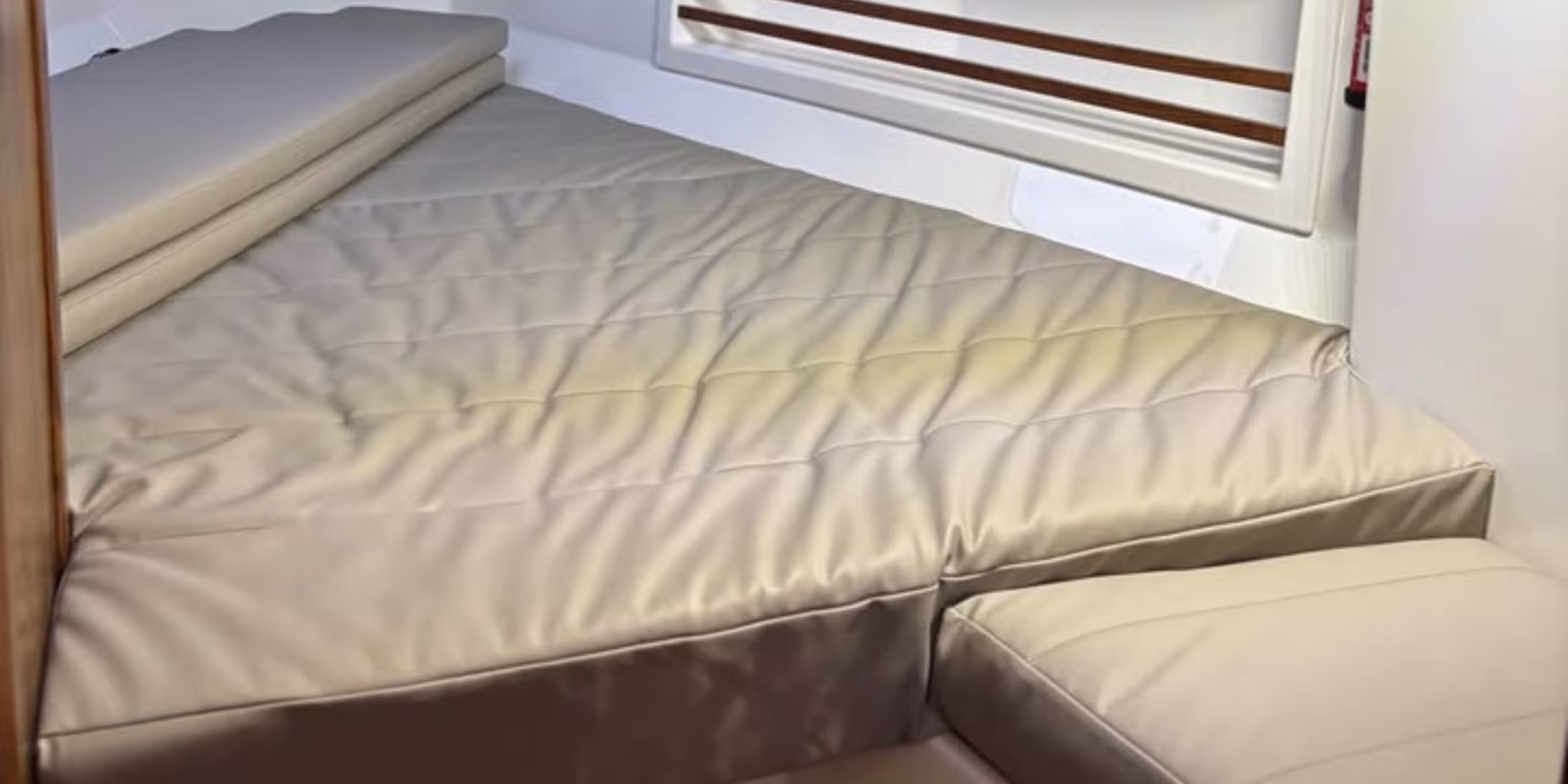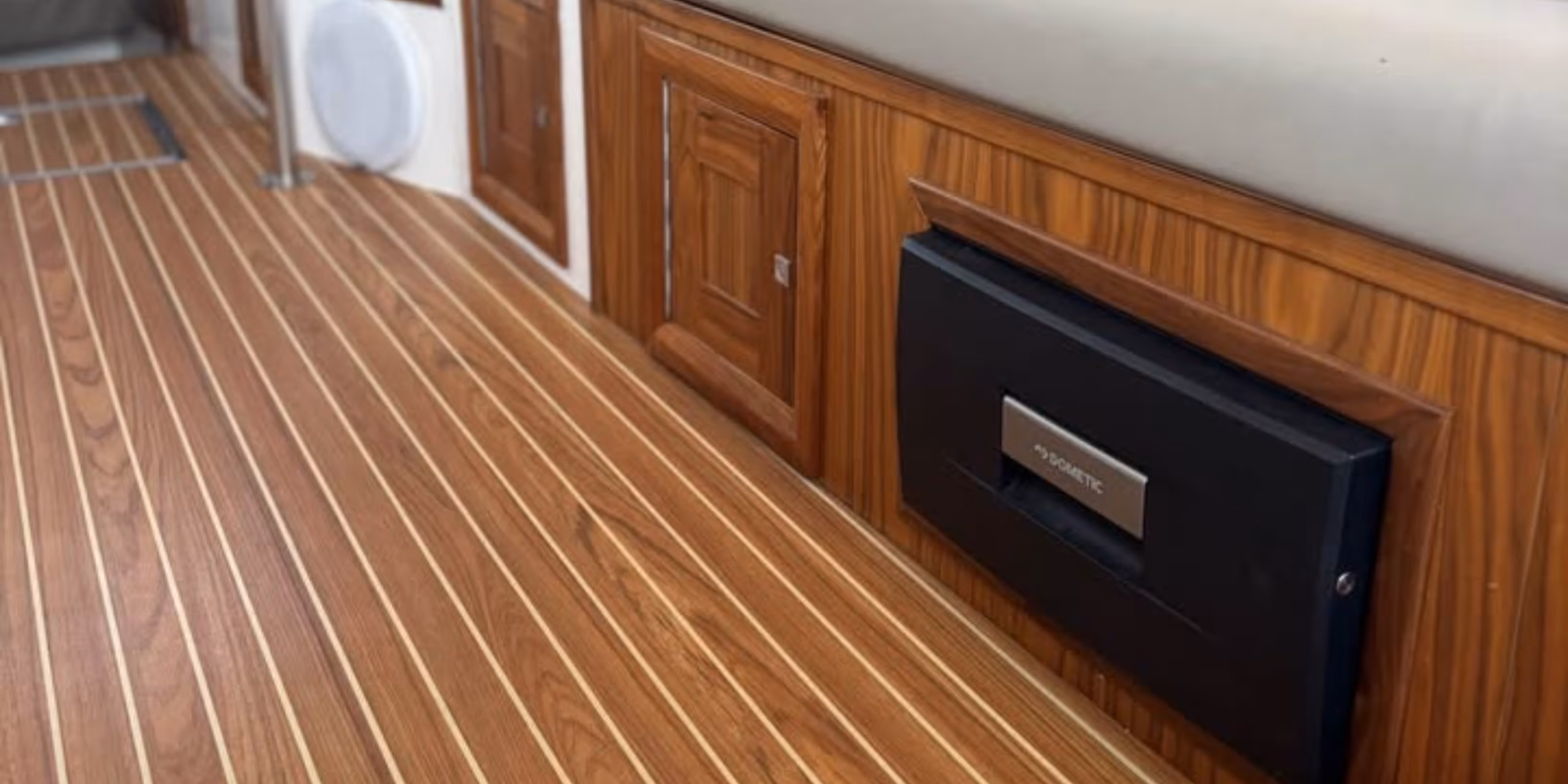 Forward double V-berth cabin with storage. Separate toilet and shower compartment. Teak and holly flooring throughout the cabin. Cabin heating fitted. Bright interior with LED lighting and overhead roof hatches.