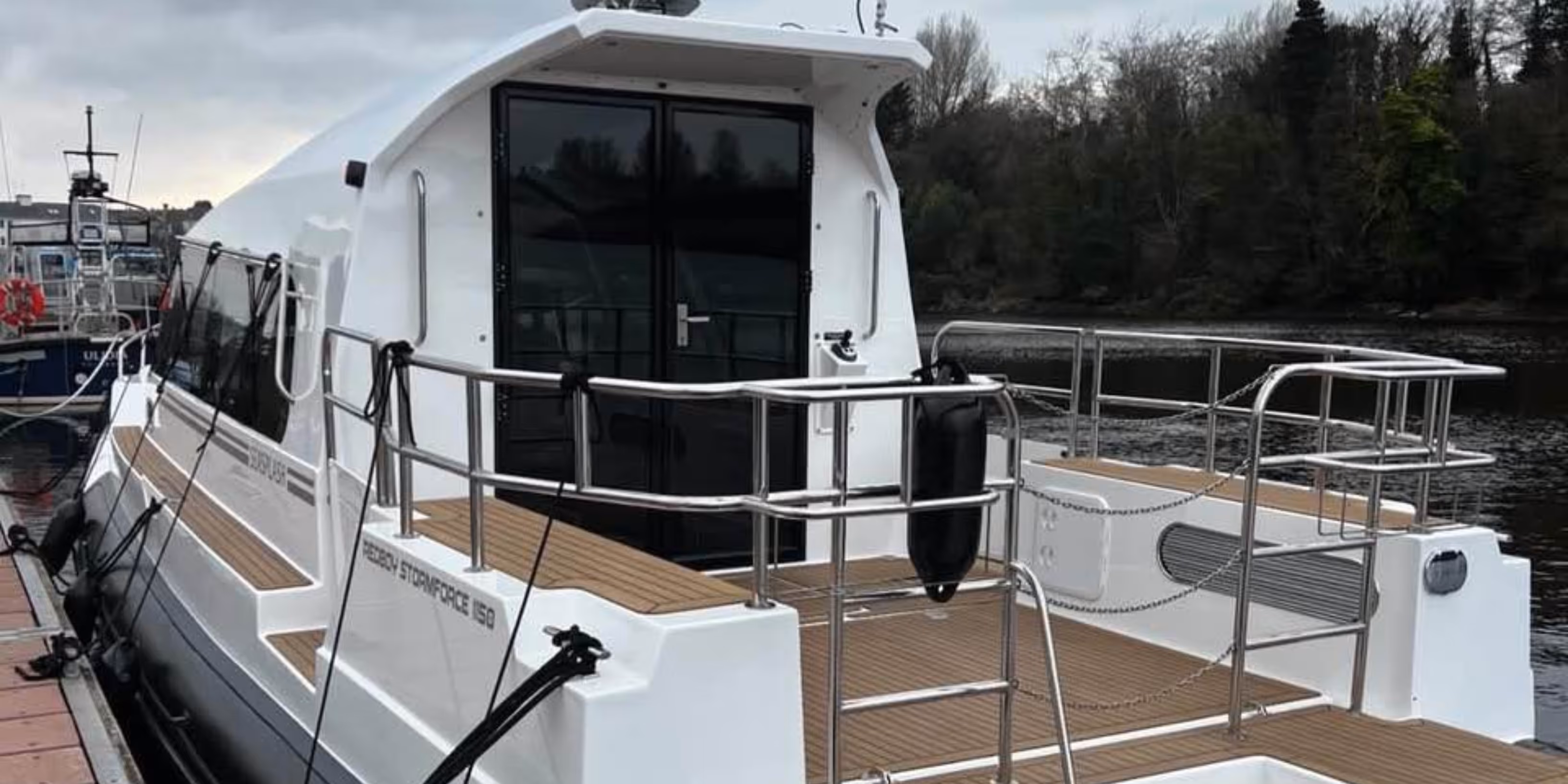 Built in Redbay’s Cushendall facility in Northern Ireland, the Stormforce 1150 reflects the company’s more than four decades of boat-building experience and its “when you must go to sea” design ethos. The hull is a high-integrity deep-V marine grade laminate with integrated spray rails, offering a balance of stiffness, impact resistance and seakeeping performance. The collar system is heavy-duty 1200 GSM Hypalon bonded along the hull, providing secondary buoyancy and protecting the hull through rough water operations. Structural bulkheads and reinforced deck joints ensure longitudinal strength and load distribution, suitable for offshore conditions. The enclosed wheelhouse structure is engineered to withstand sustained offshore stress and is glazed with robust marine-rated windows for durability and visibility. Through-hull fittings, anchoring systems and deck hardware are marine-spec corrosion resistant, while internal joinery uses quality materials matched to the vessel’s functional and cruising focus.