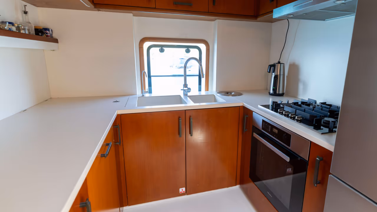 Three guest cabins all en suite plus a separate crew cabin for two. Cruisair air conditioning throughout 96,000 BTU, Somfy remote blinds, ceilings renewed 2020, carpets new 2025. Galley by Miele with oven, 4-burner gas, extractor and dishwasher, refrigeration across Miele 400 l twin door plus Isotherm 60 l and Waeco 30 l, separate Arçelik 90 l freezer and two Liebherr 90 l fridges. Raymarine suite with HybridTouch 22” plus 9” E90W, Quantum 2 radar, ST60 depth/log, Ray240E VHF, cameras incl. Raymarine and five Hikvision. Samsung 43” TV and Fusion multizone audio. 4 m Brig RIB with Yamaha 50 hp, Ezberci retractable passerelle and 500 kg flybridge crane from 2022, Lofrans Titan windlass, Speich wipers. Hydraulic helms lower and flybridge.