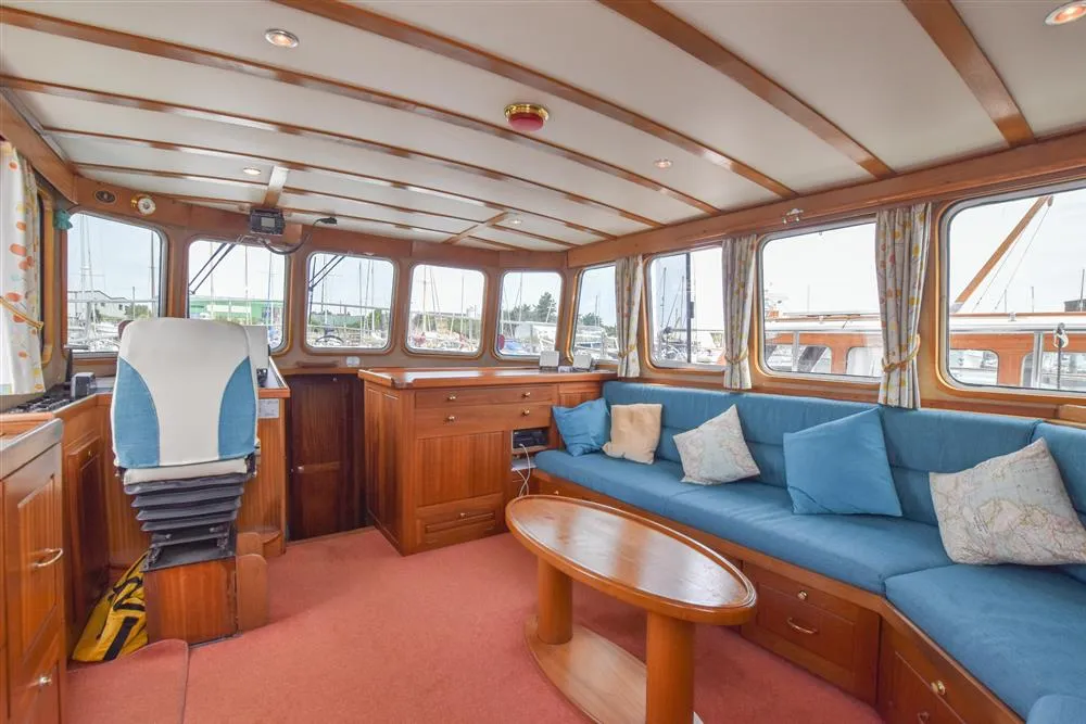 The 1999 Vripack Stentor 1300 is a steel explorer yacht built for inland, coastal and offshore cruising. She carries 4,250 L (≈ 1,122 US gal) of fuel, a 250 L (66 gal) blackwater tank and 120 L (32 gal) greywater tank. Powered by a Perkins Sabre M130C diesel, she cruises at ~6 knots using 8 L/h and reaches ~9 knots maximum. The layout includes two cabins, two heads (freshwater flush), a raised saloon with internal helm, electric galley via inverter, heating and full generator backup. She features a 13.31 m length, 4.40 m beam and a steel hull with strong structural framing. Currently listed at £115,000 and ideal for serious liveaboard cruising.